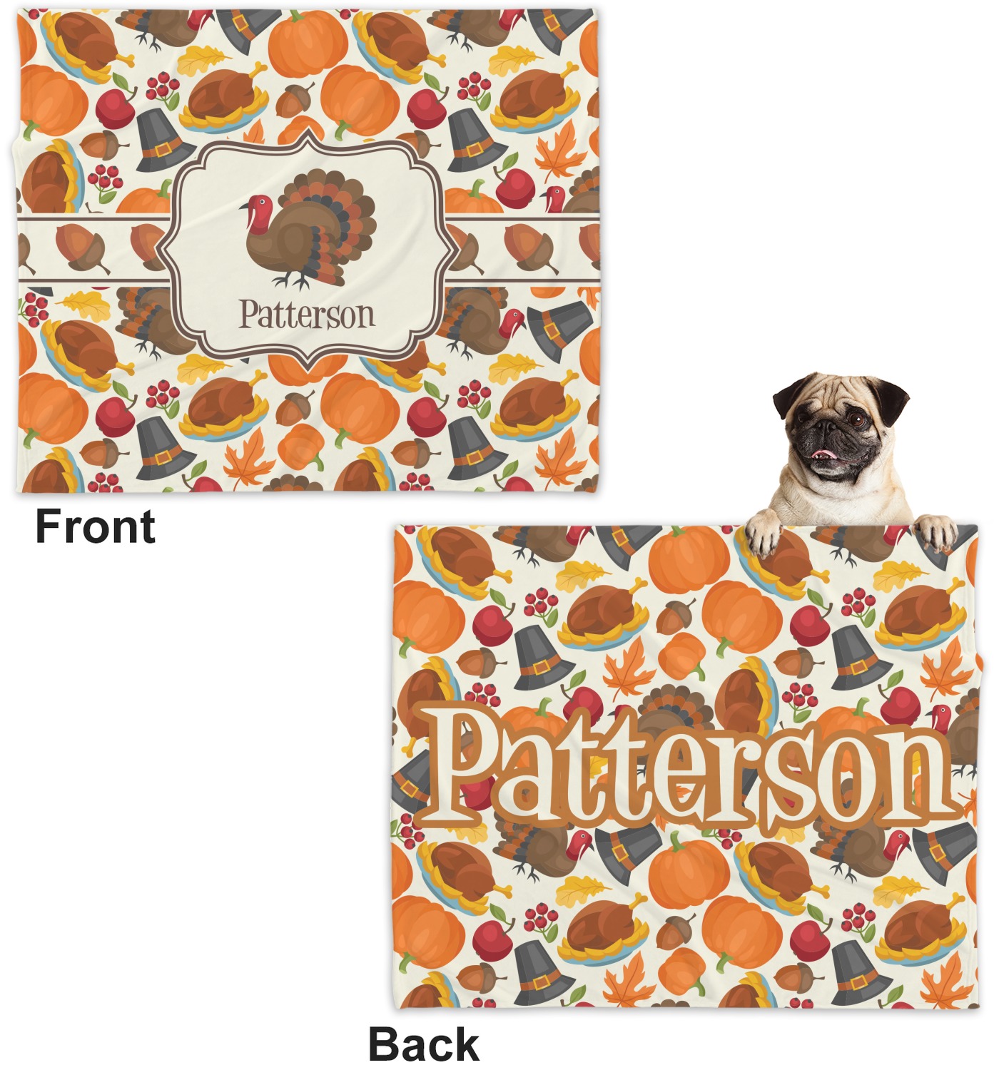 This traditional thanksgiving design is perfect for celebrating the season of giving thanks. This classic design includes turkey, pumpkin, pilgirm hat, berries, apples, acorns and leaves. The background on this design is re-color-able; and we chose the light yellow from the fall / thanksgiving color palette in our customization system.