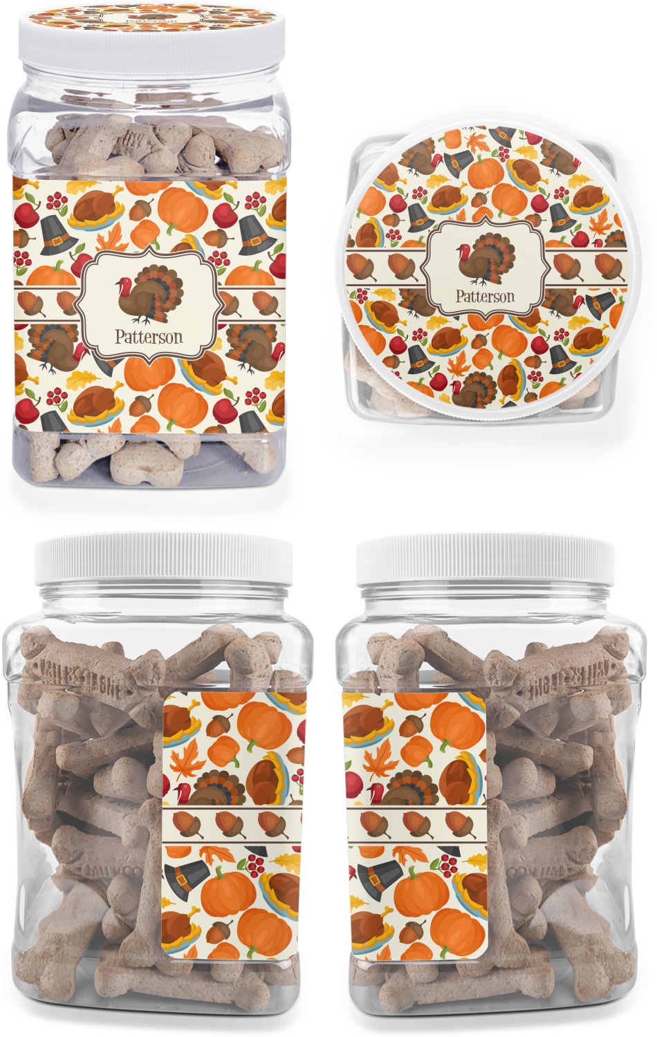 This half gallon jar, made from a sturdy plastic, is the perfect way to keep treats from any naughty pet paws, while still keeping them ready on hand for when your pup performs an impressive trick. This dog cookie jar features a screw-on, white lid that displays your personalized design on a vinyl sticker. We apply another customized sticker that wraps around the front and sides of the jar. Our dog treat jar also has indentations on the rear ends of the sides, which allows for convenient handling, and its square frame allows for easy storage.