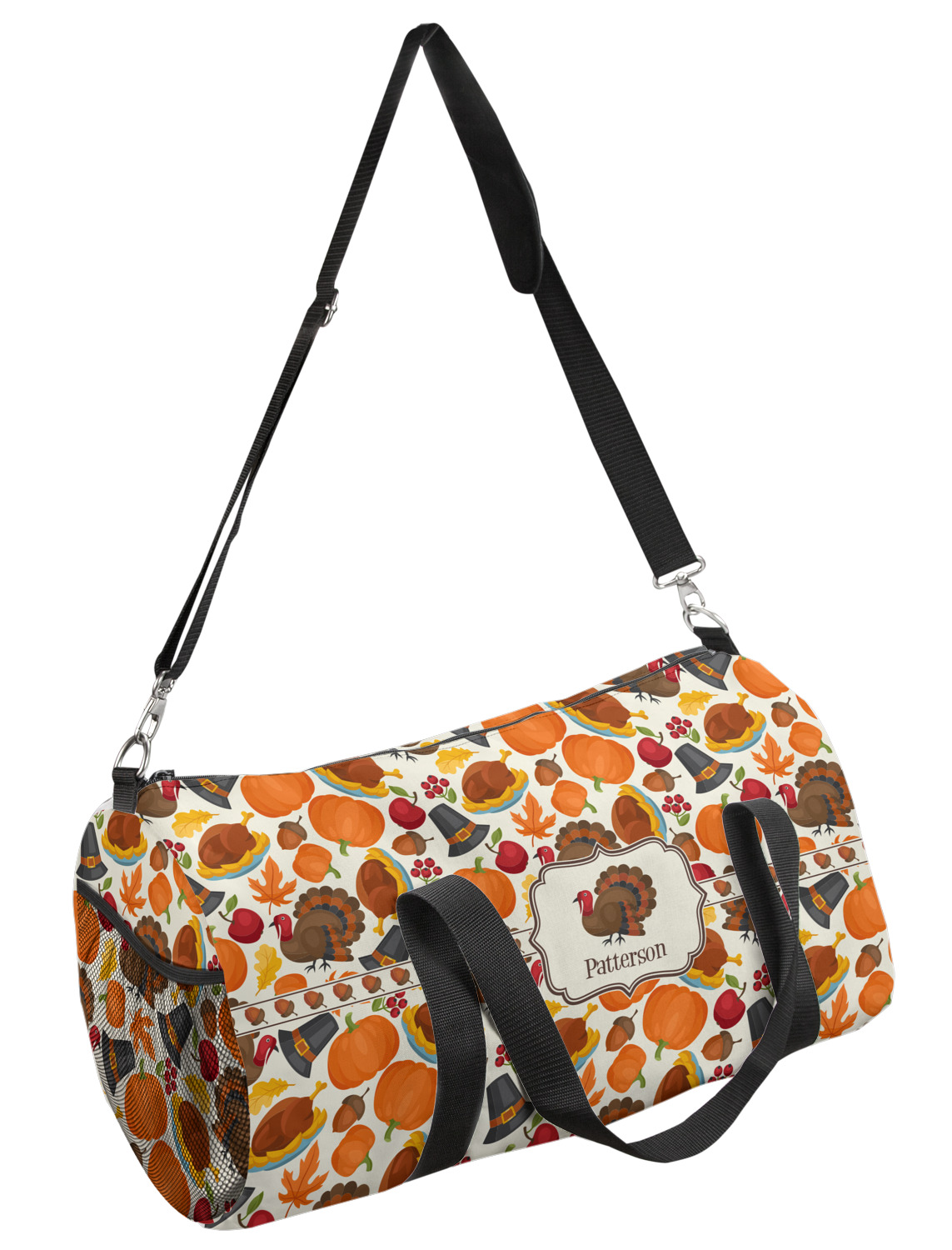 This duffle is a sturdy bag made of a canvas material. It comes in two sizes: Small (19"W x 9.5"H x 9.5"D) and Large (23"W x 12"H x 12"D). The bag is a cylindrical shape with a black adjustable strap and two handles. On one side is an elastic pouch to put a waterbottle or other small item. Your product will be sublimated with your design and is able to be designed on the front, back, and sides. Be sure to remember that the straps may cut into parts of your design if you upload your own artwork.