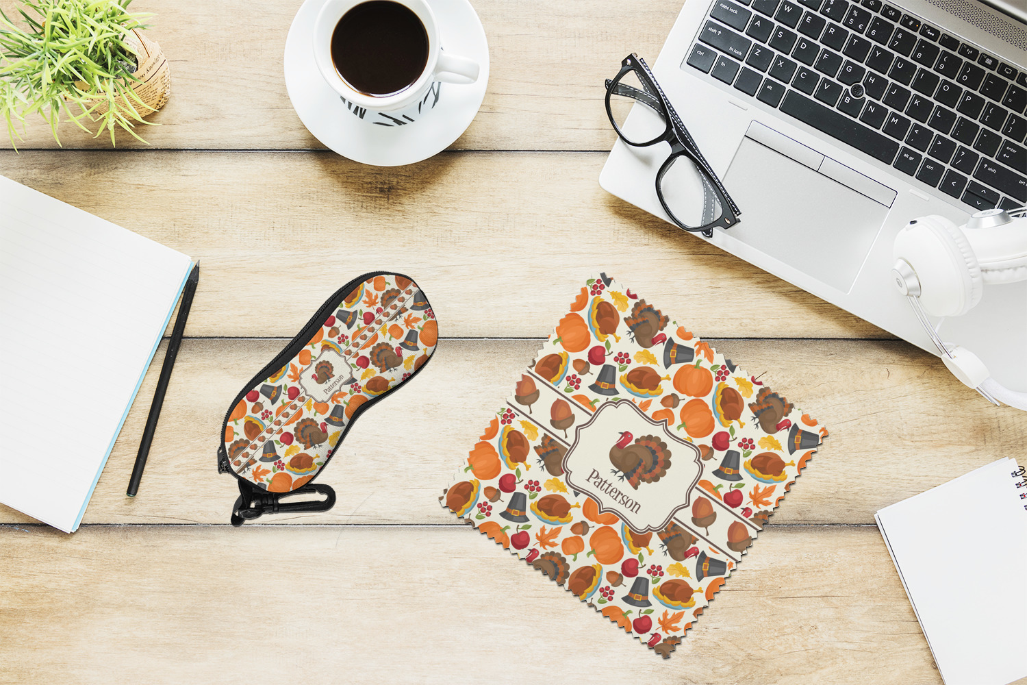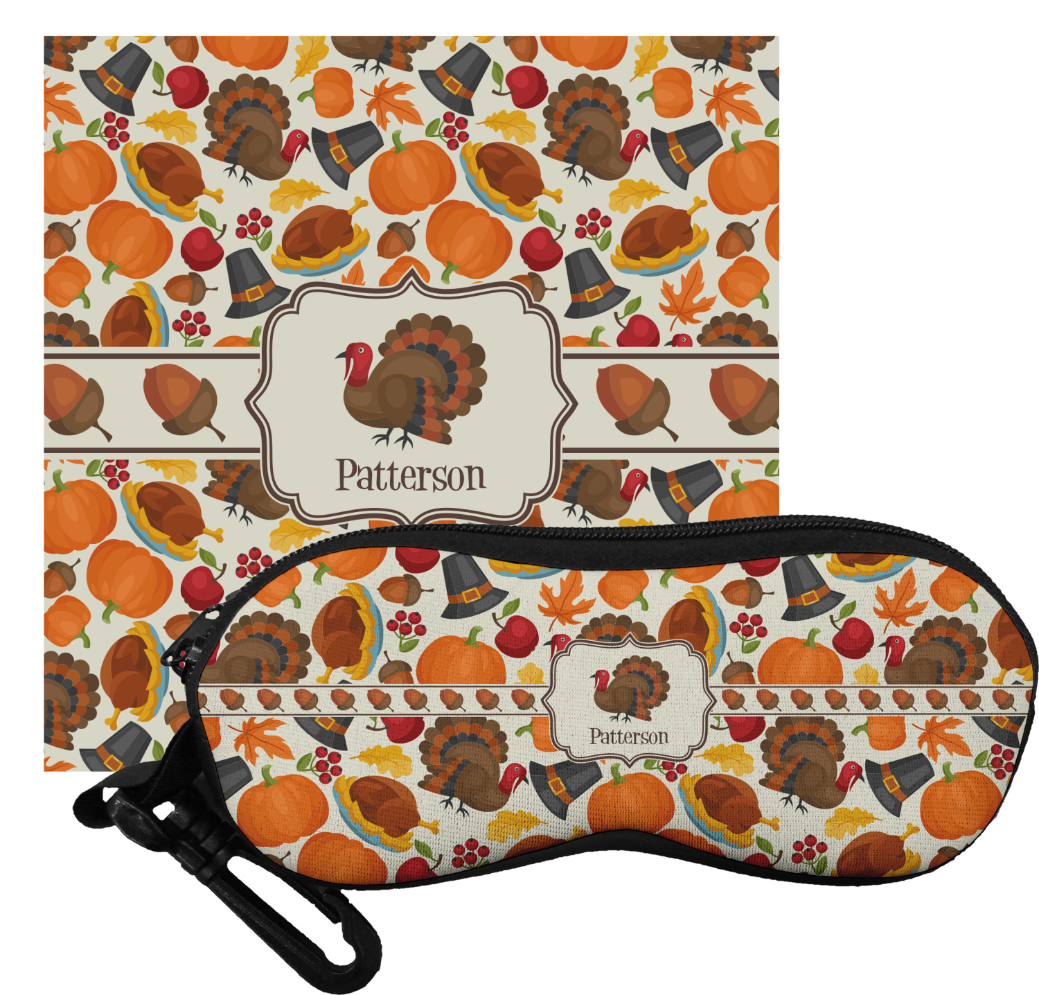 This traditional thanksgiving design is perfect for celebrating the season of giving thanks. This classic design includes turkey, pumpkin, pilgirm hat, berries, apples, acorns and leaves. The background on this design is re-color-able; and we chose the light yellow from the fall / thanksgiving color palette in our customization system.
