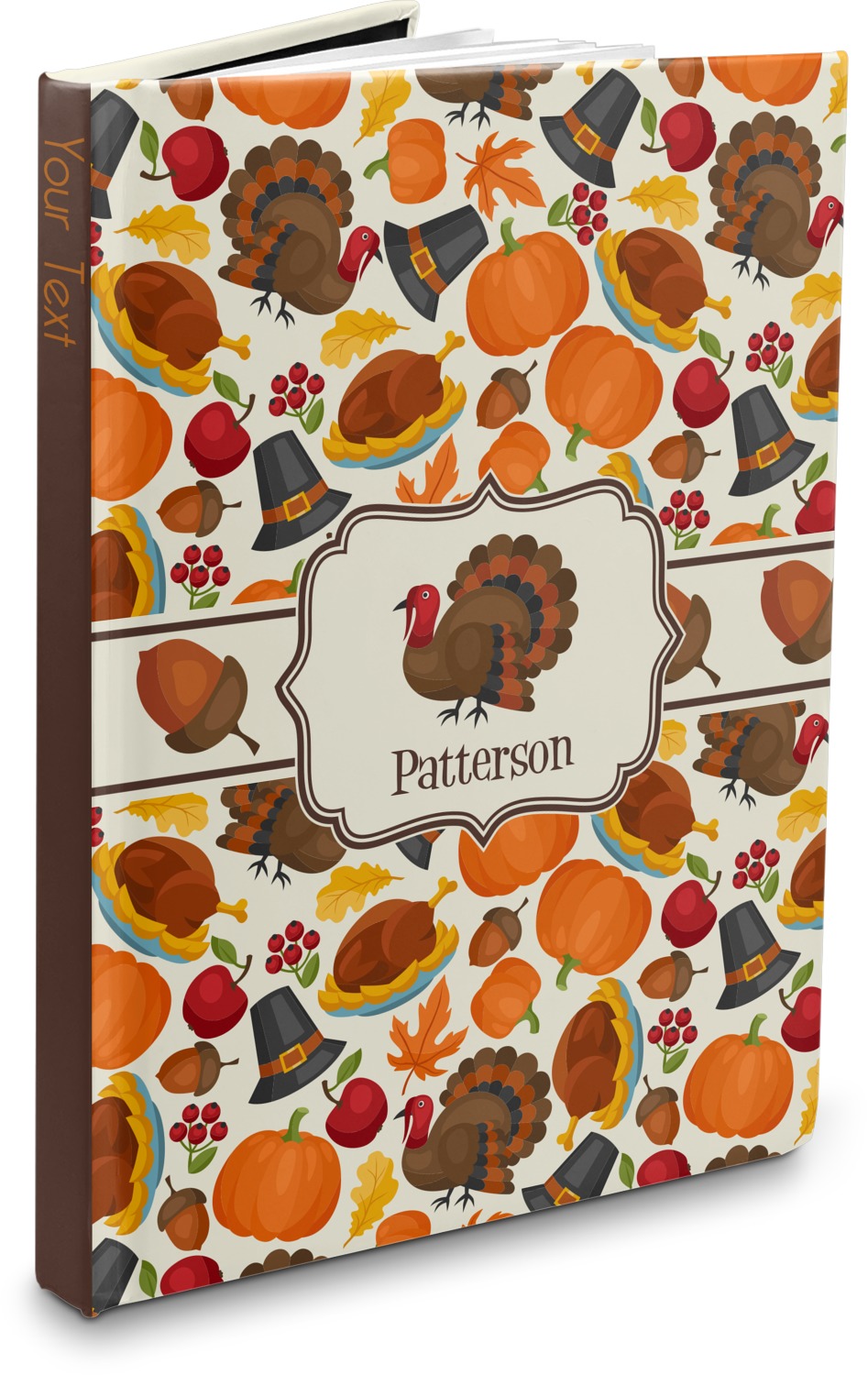 This traditional thanksgiving design is perfect for celebrating the season of giving thanks. This classic design includes turkey, pumpkin, pilgirm hat, berries, apples, acorns and leaves. The background on this design is re-color-able; and we chose the light yellow from the fall / thanksgiving color palette in our customization system.