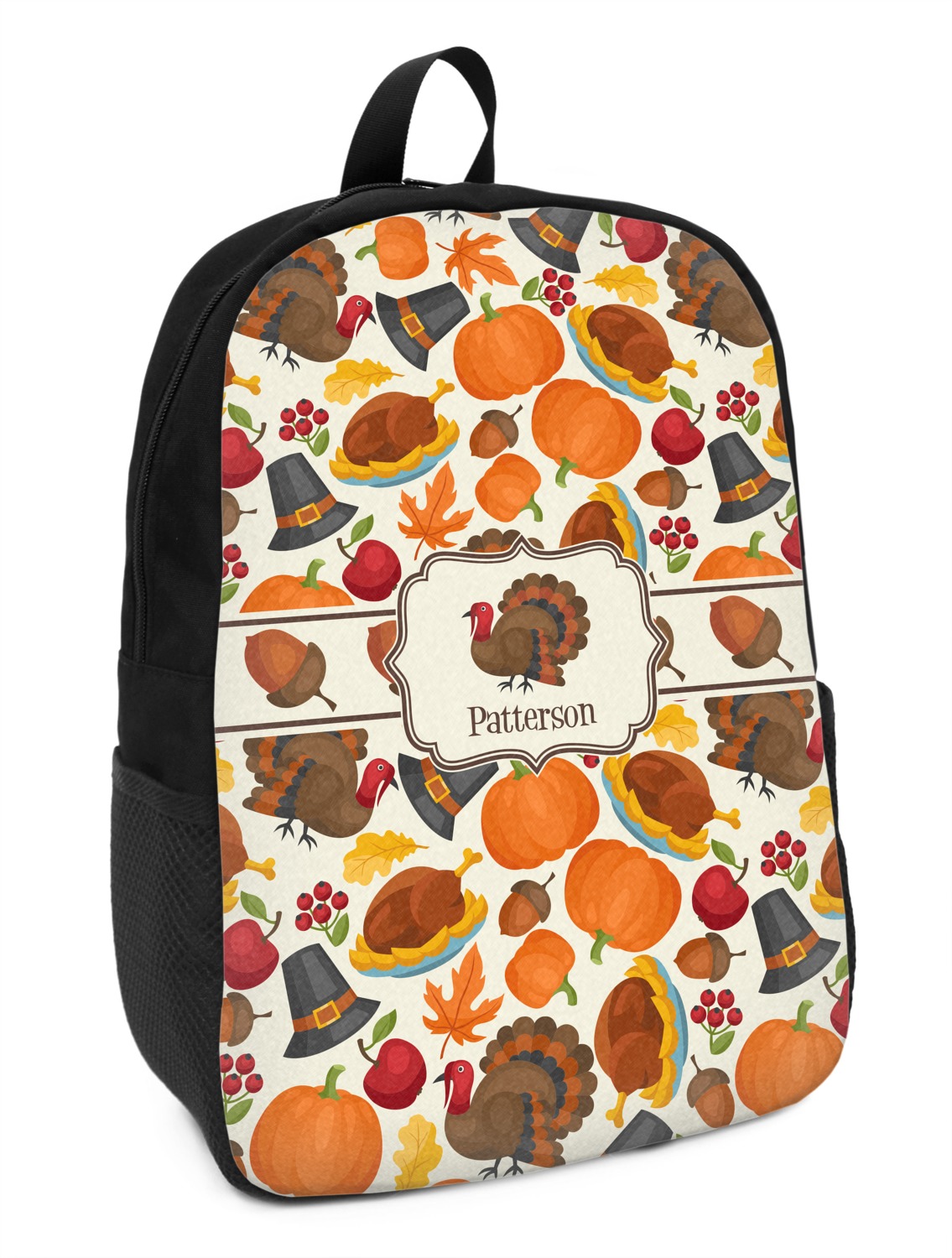 This traditional thanksgiving design is perfect for celebrating the season of giving thanks. This classic design includes turkey, pumpkin, pilgirm hat, berries, apples, acorns and leaves. The background on this design is re-color-able; and we chose the light yellow from the fall / thanksgiving color palette in our customization system.