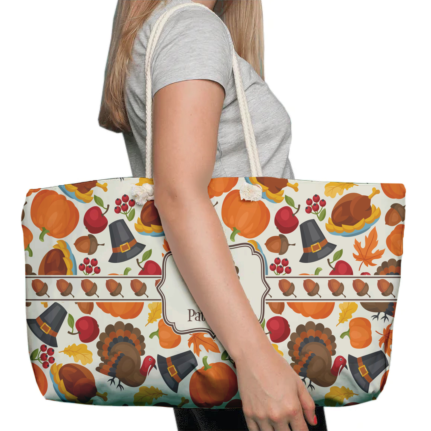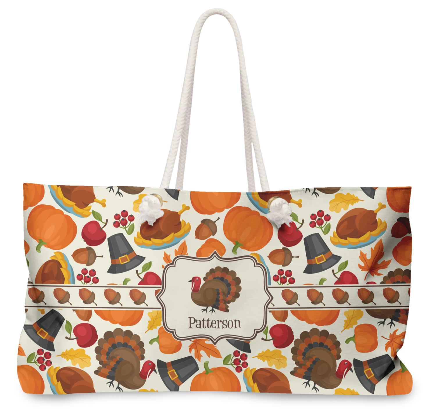 Our oversized weekender tote with rope handles is perfect for your weekend at the beach or on the town. This large tote are 24" W X 13" H, with a 5" gusset and a 27" thick rope handles with a knot that is put through a grommeted brass hole.