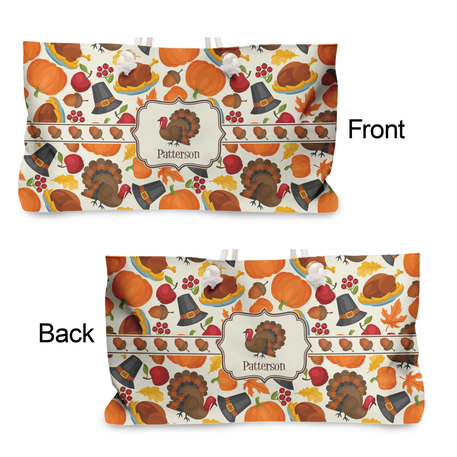 This traditional thanksgiving design is perfect for celebrating the season of giving thanks. This classic design includes turkey, pumpkin, pilgirm hat, berries, apples, acorns and leaves. The background on this design is re-color-able; and we chose the light yellow from the fall / thanksgiving color palette in our customization system.