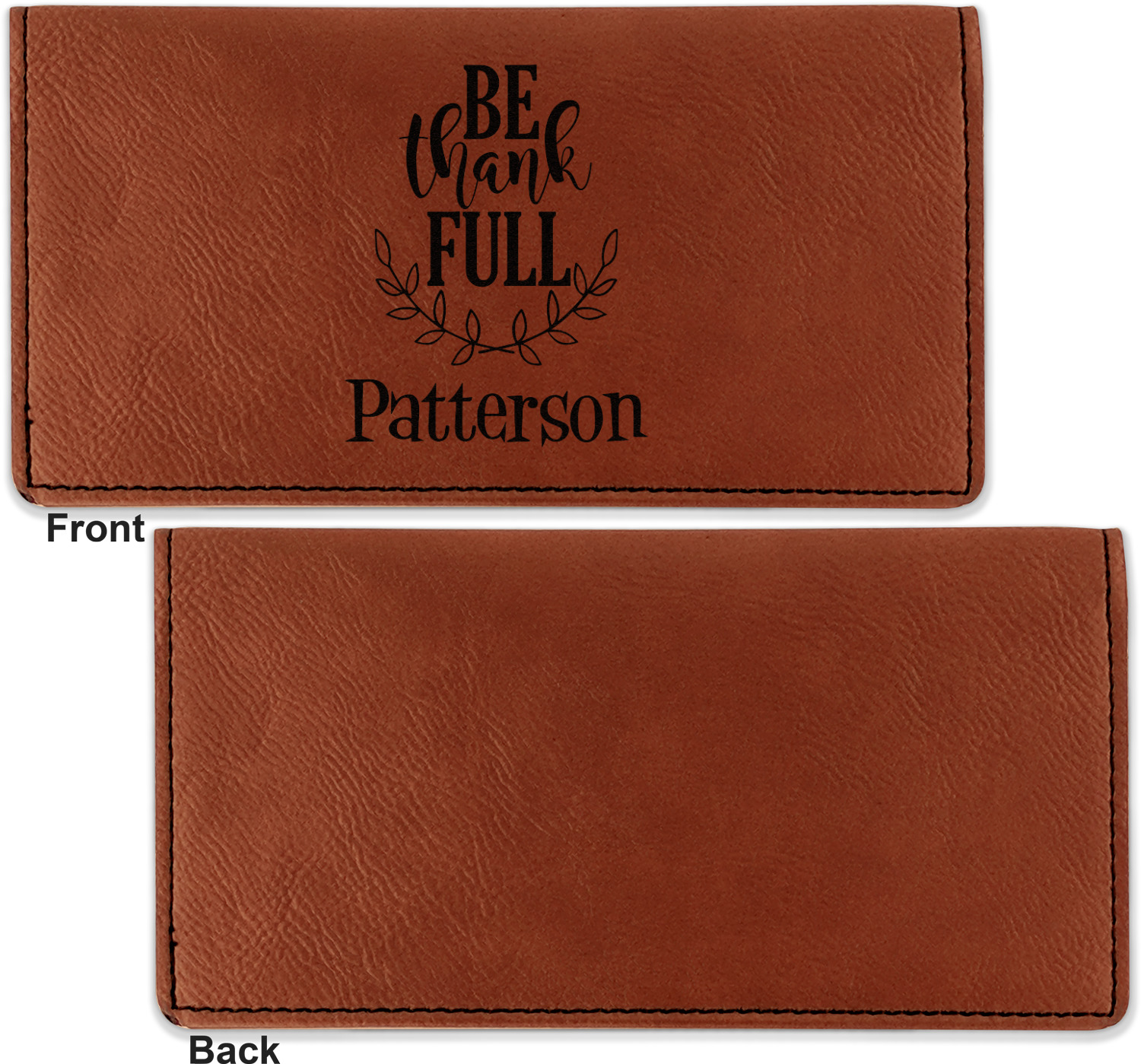 Go into our design center to start personalizing. Your checkbook cover will be laser engraved, making the graphic or text a black color. Choose a fun saying, monogram, or font to go on your checkbook cover. You have the opportunity to do it double or single sided.