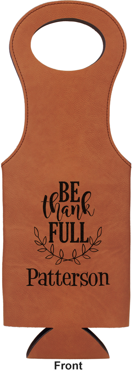 This wine carrier is made from a stunning leatherette, in a cognac-brown color. Strong, black stitching lines the sides of your wine bottle bag and provides extra durability. The interior is lined with a padded, black material to allow for a snug fit once your bottle is placed inside. At the top of this wine gift bag, you'll find two oval shaped handles that elegantly complements the rest of the bag's style. We provide you with the option of laser-engraving the front, or the front and back of your new personalized wine bag!