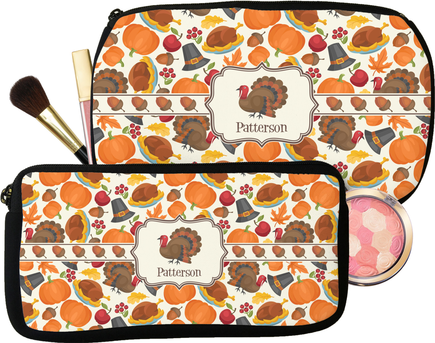 Our makeup bags are available in 2 sizes, small for smaller purses and less makeup, while the medium one for larger purses, as well as more makeup. Neither one of these is big enough for me when I am traveling - so, we do carry custom toiletry bags for travel.