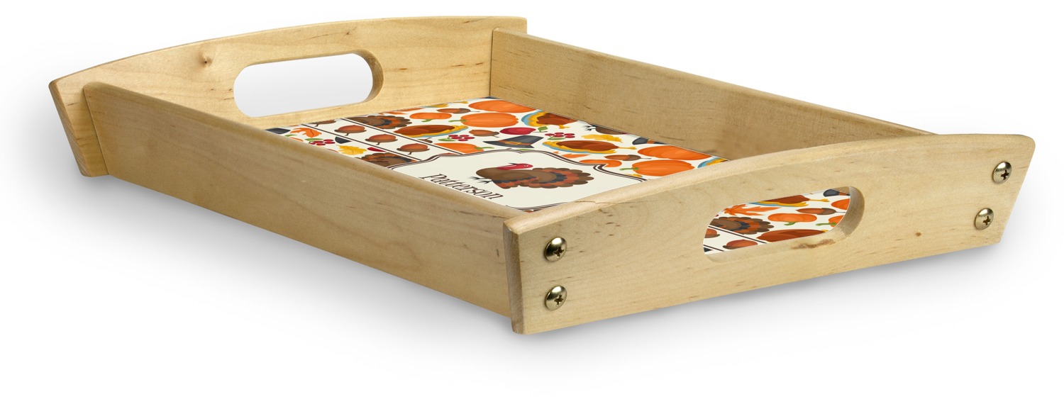 This serving tray with handles features square edges and two rounded sides, creating a very modern look. Each side is fabricated from a beautifully cut, natural wood. The bottom of the interior of the tray displays your customized design in bright, vibrant color. The tray is sold in both a black color and a natural wood look. Each variation of the wood serving tray has two sizes: Small, which is 14" x 10" x 2.25", and Large, which is 19.5" x 13.5" x 2.75".