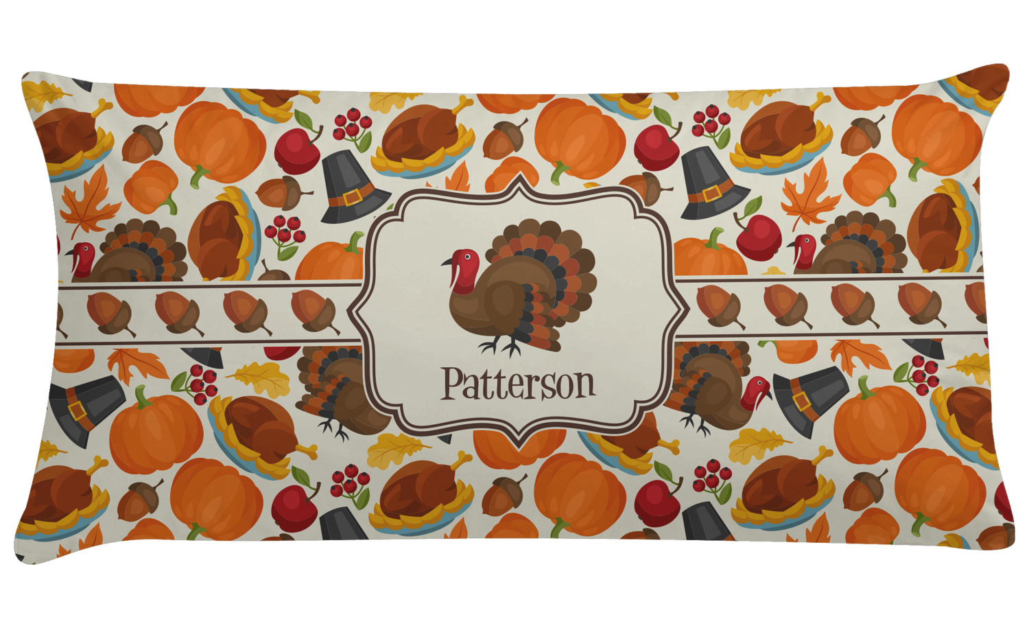 This traditional thanksgiving design is perfect for celebrating the season of giving thanks. This classic design includes turkey, pumpkin, pilgirm hat, berries, apples, acorns and leaves. The background on this design is re-color-able; and we chose the light yellow from the fall / thanksgiving color palette in our customization system.