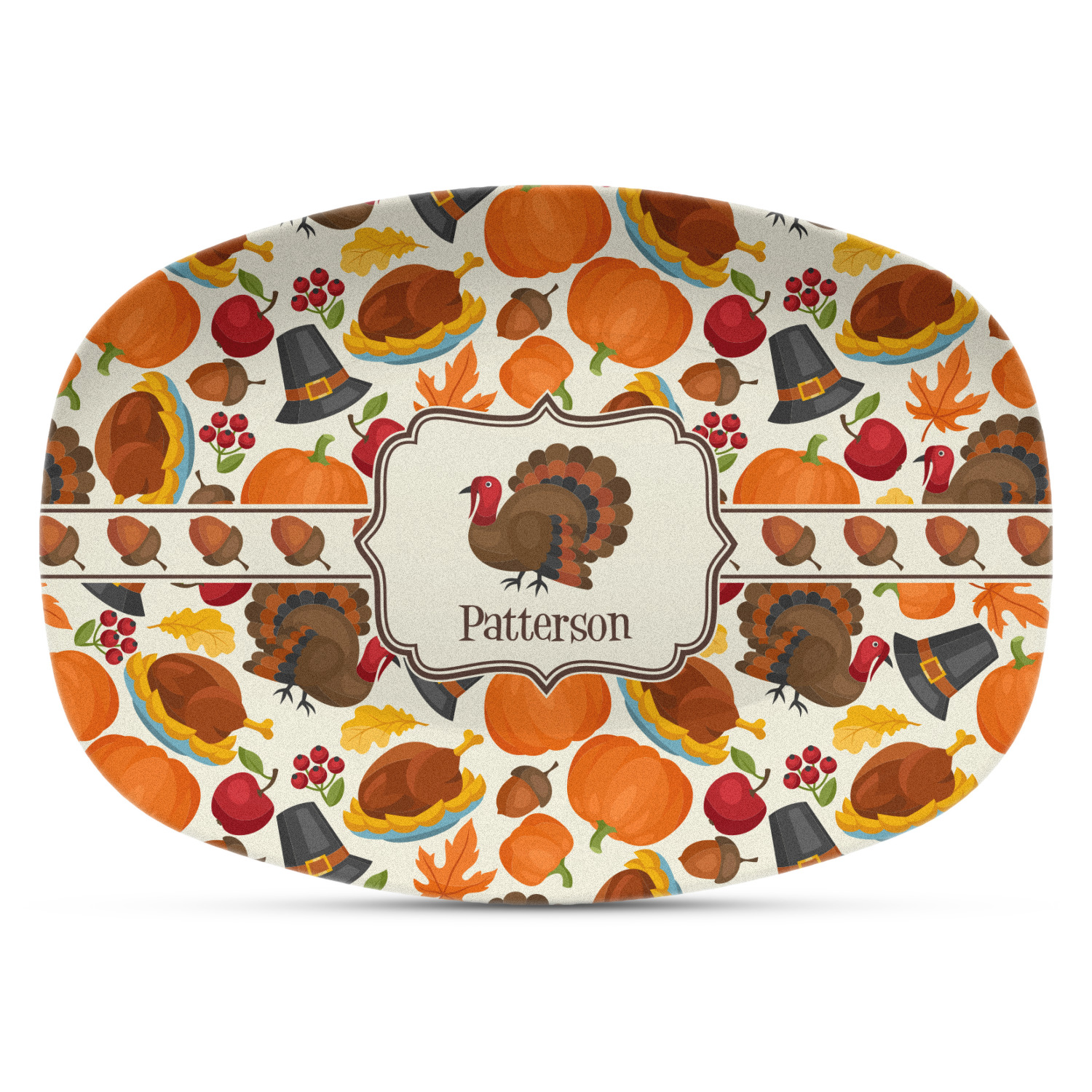 This traditional thanksgiving design is perfect for celebrating the season of giving thanks. This classic design includes turkey, pumpkin, pilgirm hat, berries, apples, acorns and leaves. The background on this design is re-color-able; and we chose the light yellow from the fall / thanksgiving color palette in our customization system.