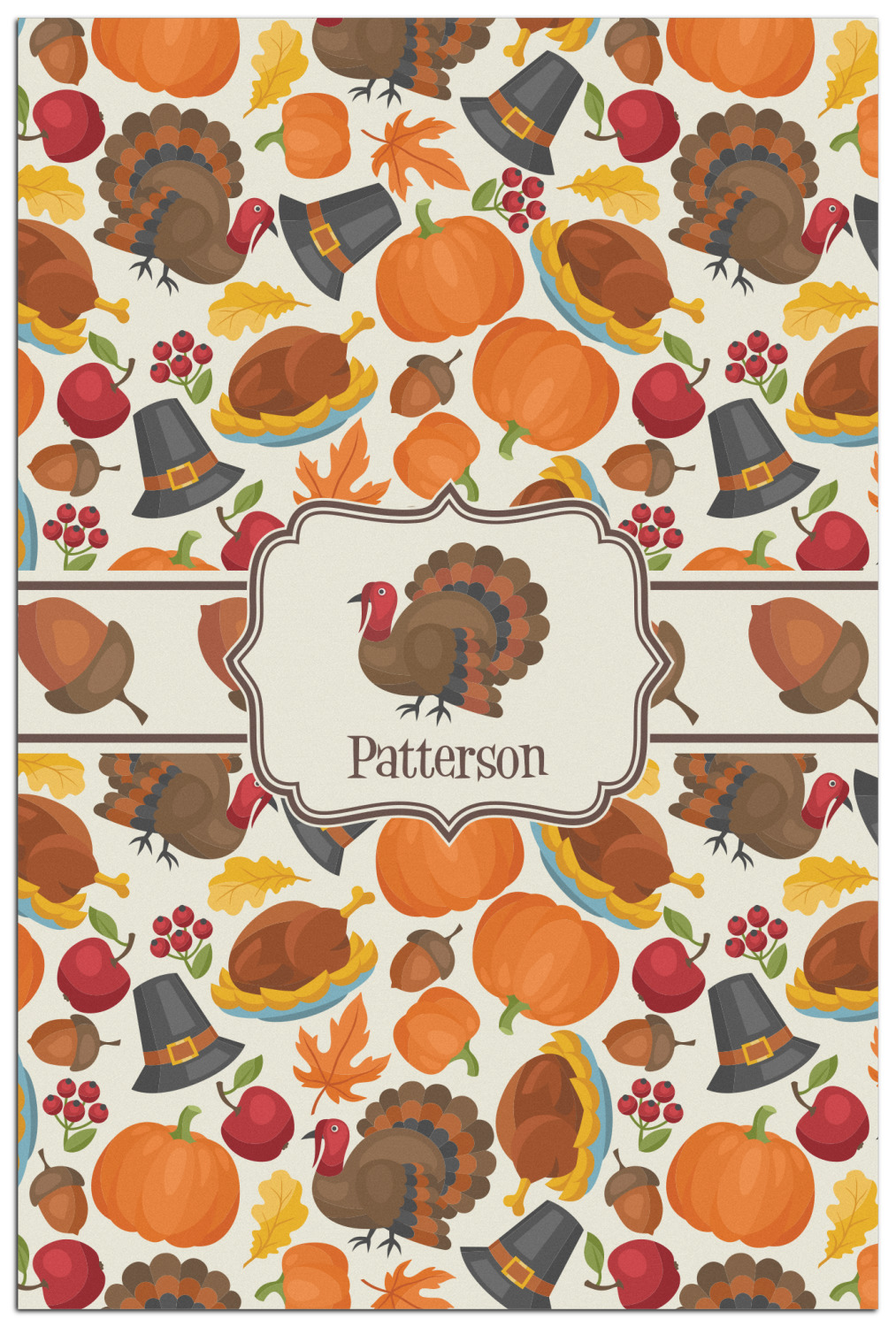 This traditional thanksgiving design is perfect for celebrating the season of giving thanks. This classic design includes turkey, pumpkin, pilgirm hat, berries, apples, acorns and leaves. The background on this design is re-color-able; and we chose the light yellow from the fall / thanksgiving color palette in our customization system.