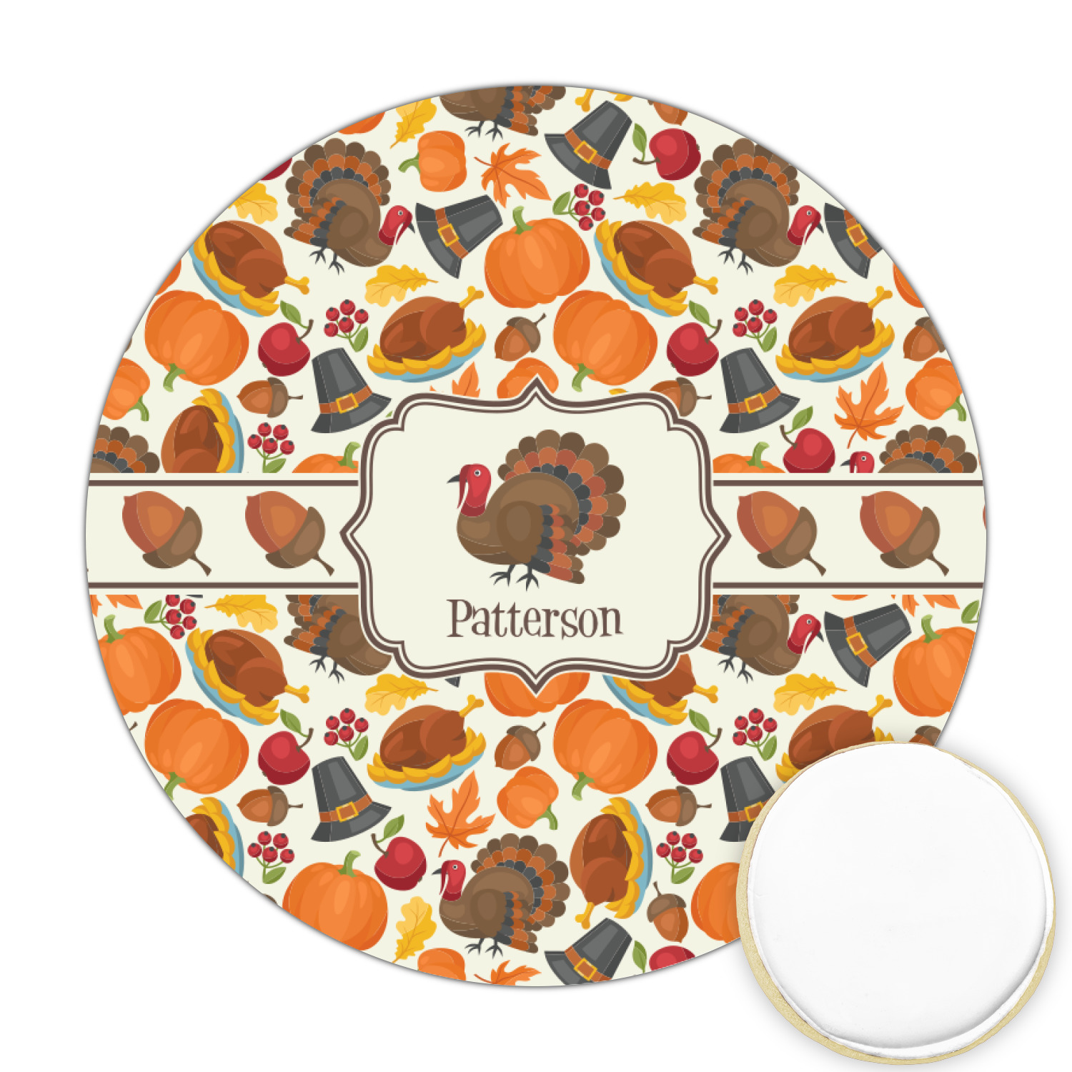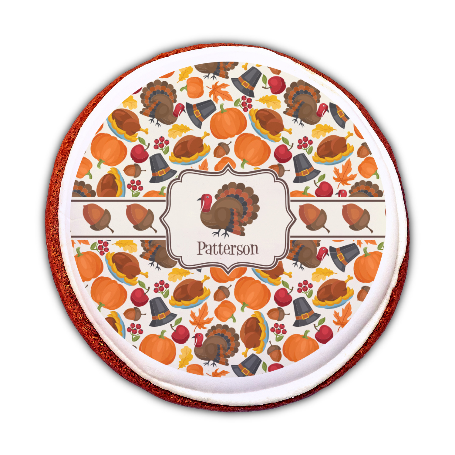 This traditional thanksgiving design is perfect for celebrating the season of giving thanks. This classic design includes turkey, pumpkin, pilgirm hat, berries, apples, acorns and leaves. The background on this design is re-color-able; and we chose the light yellow from the fall / thanksgiving color palette in our customization system.