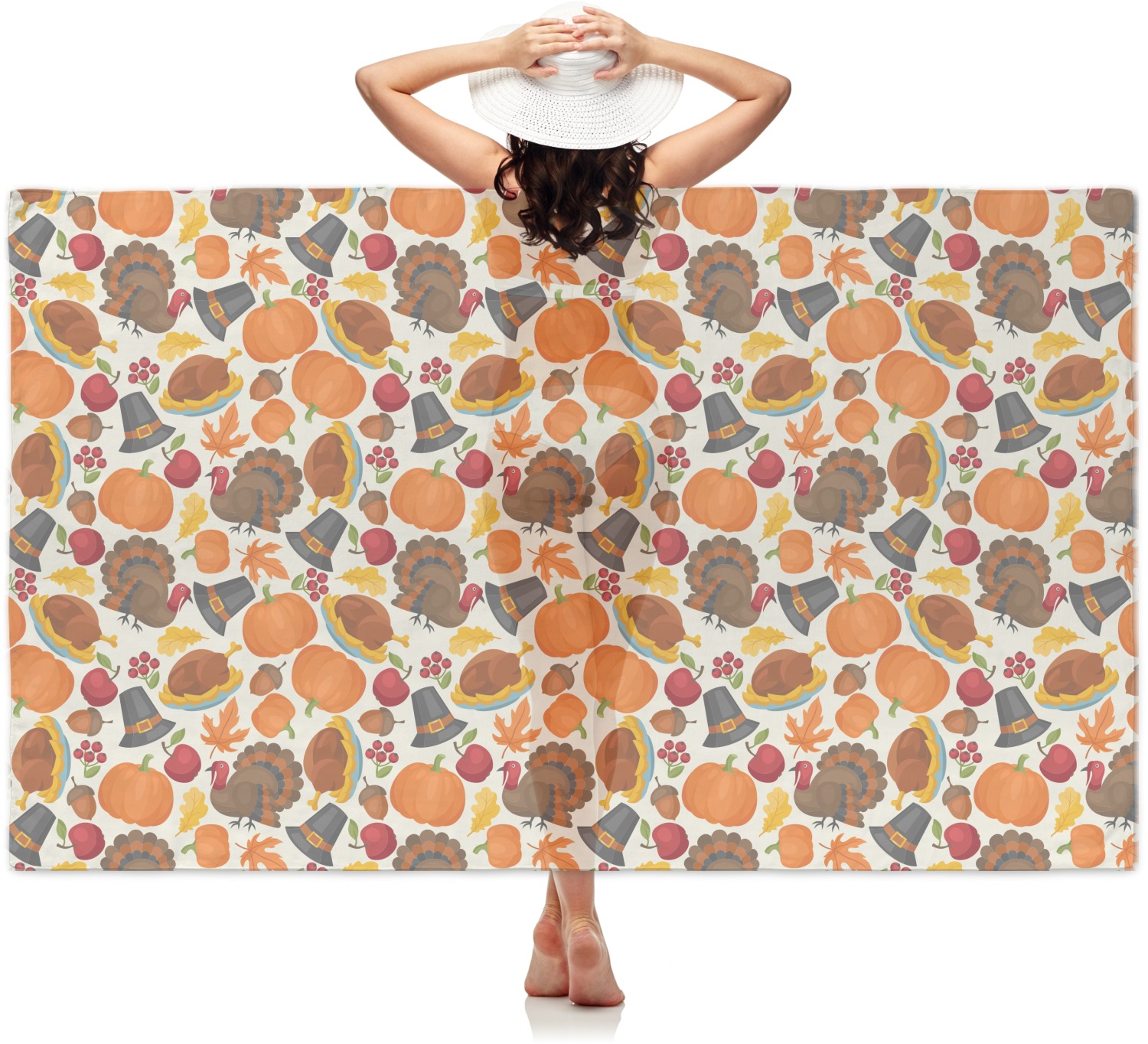 This traditional thanksgiving design is perfect for celebrating the season of giving thanks. This classic design includes turkey, pumpkin, pilgirm hat, berries, apples, acorns and leaves. The background on this design is re-color-able; and we chose the light yellow from the fall / thanksgiving color palette in our customization system.