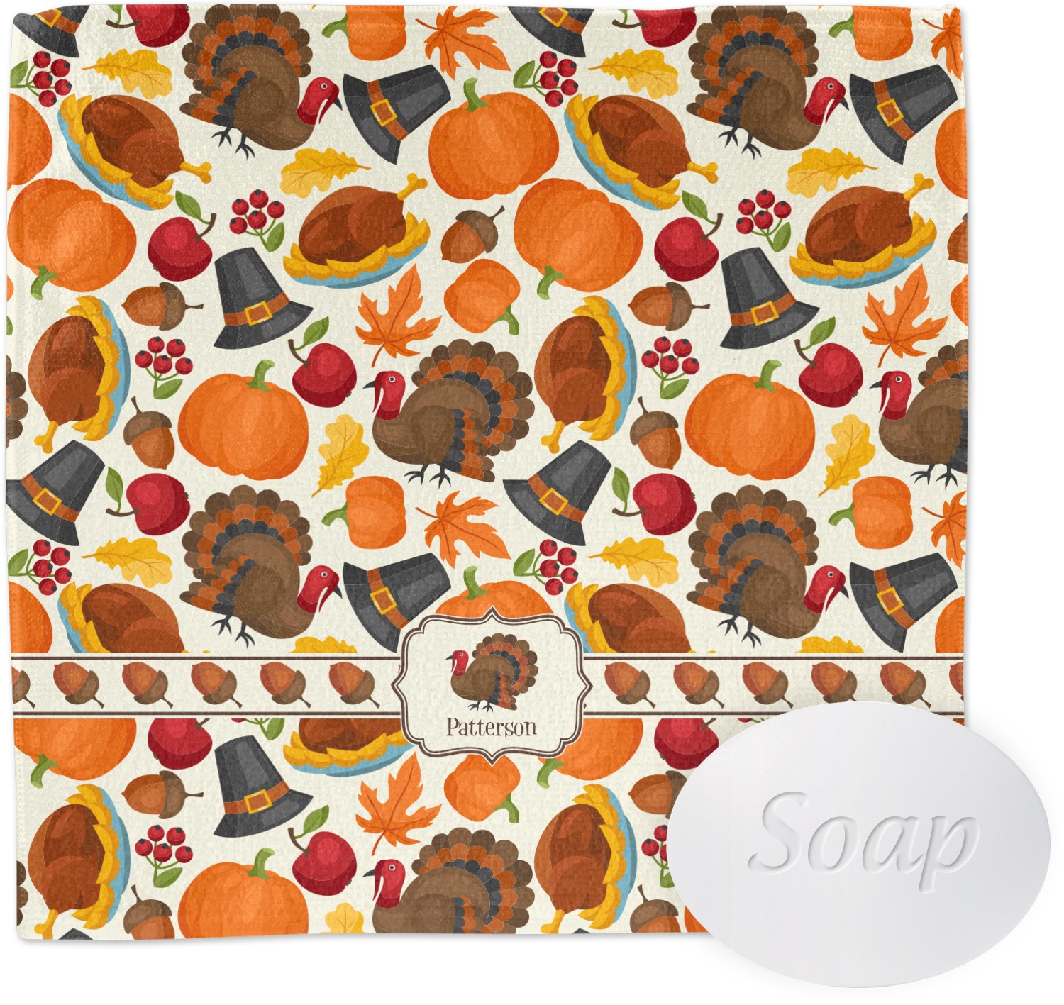 This traditional thanksgiving design is perfect for celebrating the season of giving thanks. This classic design includes turkey, pumpkin, pilgirm hat, berries, apples, acorns and leaves. The background on this design is re-color-able; and we chose the light yellow from the fall / thanksgiving color palette in our customization system.