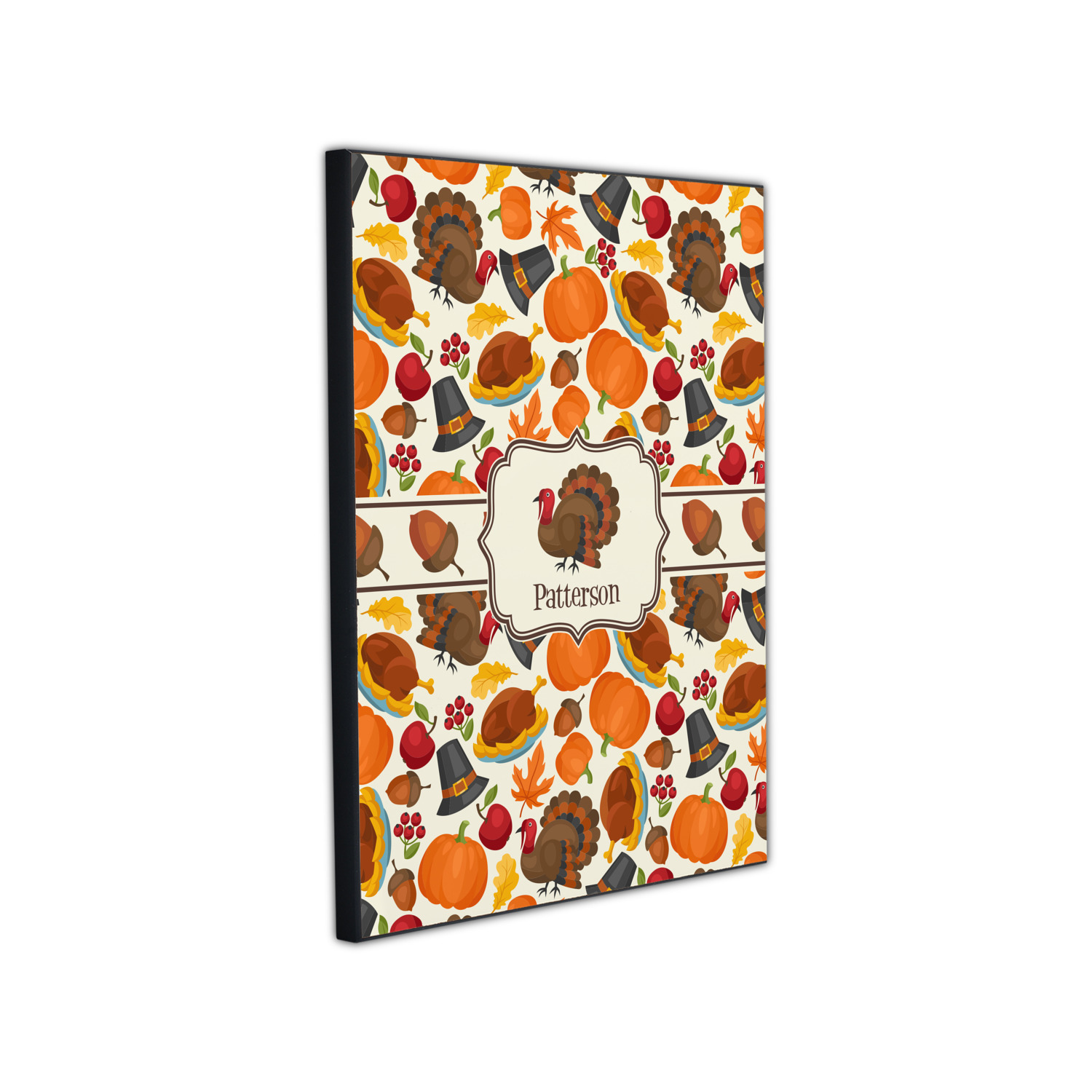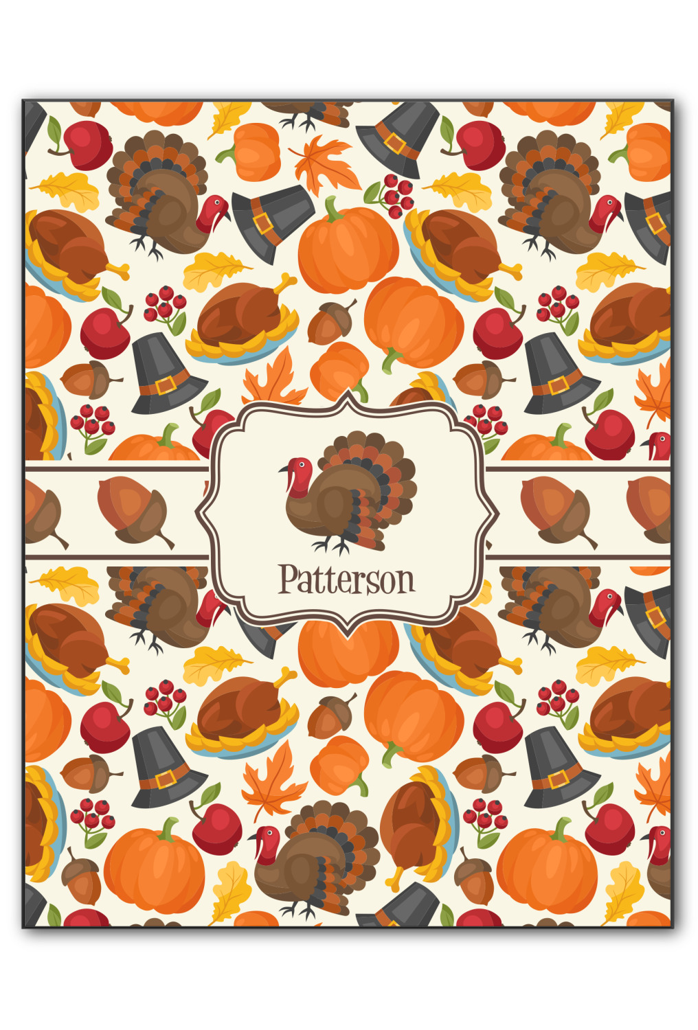 This traditional thanksgiving design is perfect for celebrating the season of giving thanks. This classic design includes turkey, pumpkin, pilgirm hat, berries, apples, acorns and leaves. The background on this design is re-color-able; and we chose the light yellow from the fall / thanksgiving color palette in our customization system.