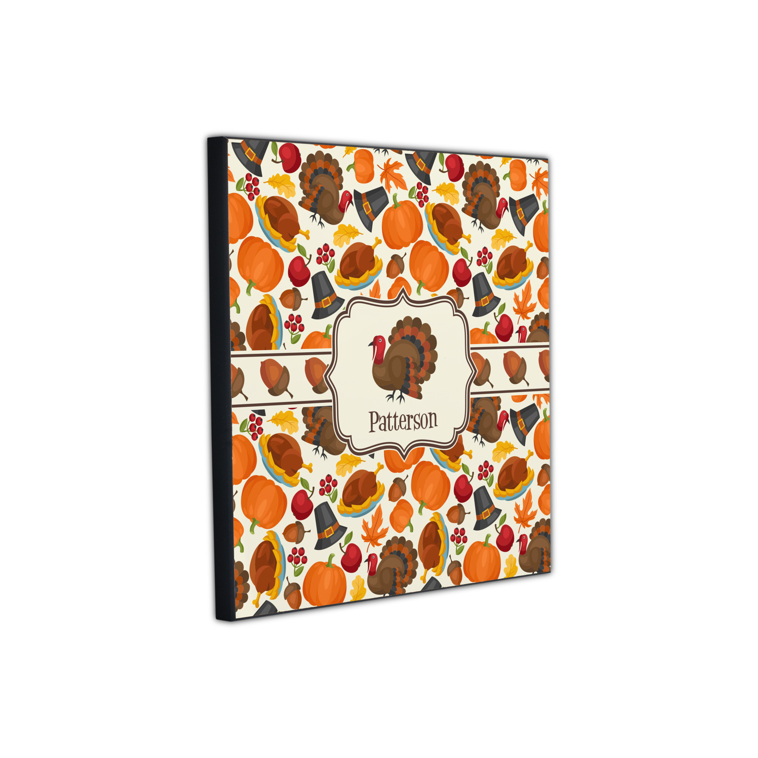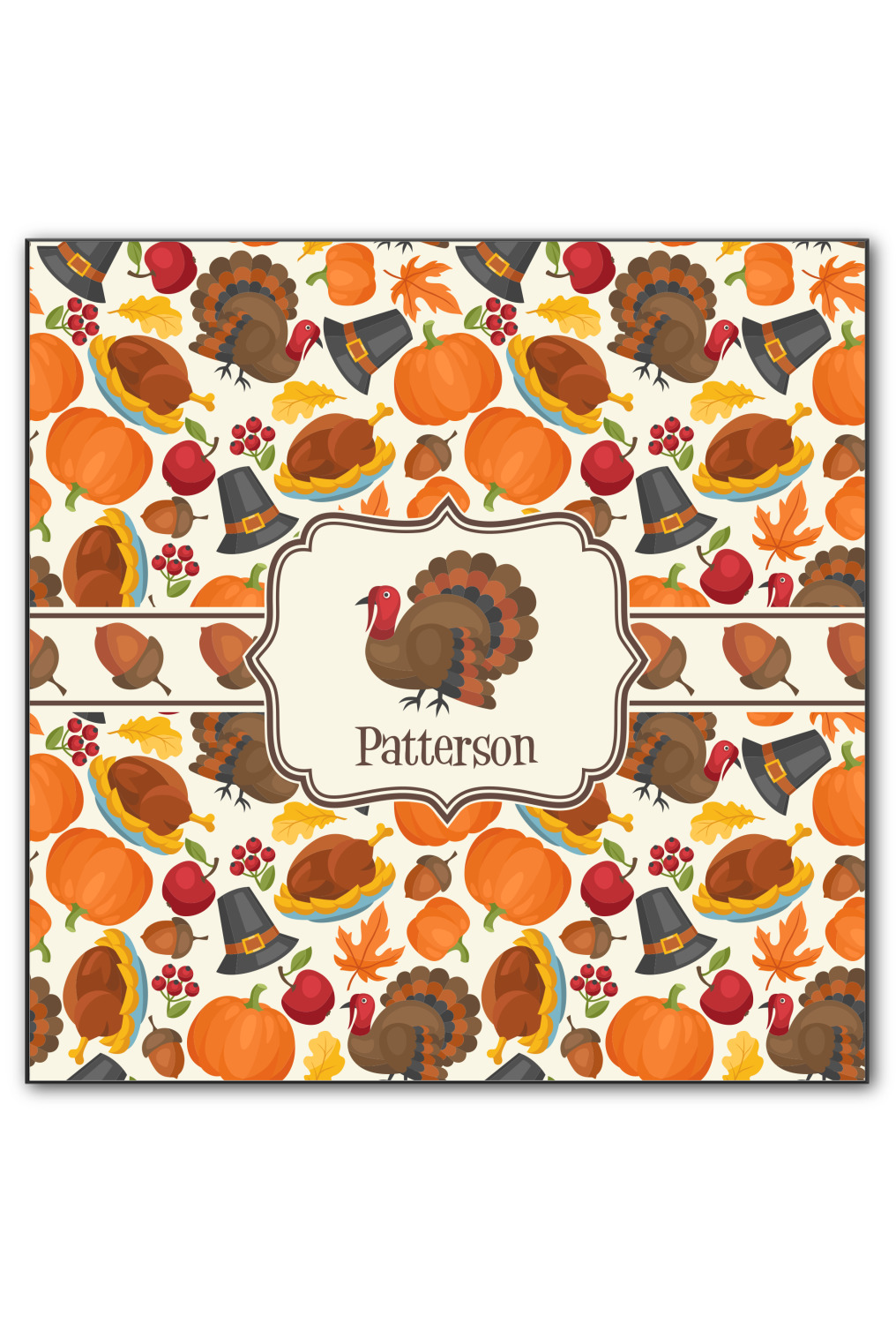 This traditional thanksgiving design is perfect for celebrating the season of giving thanks. This classic design includes turkey, pumpkin, pilgirm hat, berries, apples, acorns and leaves. The background on this design is re-color-able; and we chose the light yellow from the fall / thanksgiving color palette in our customization system.