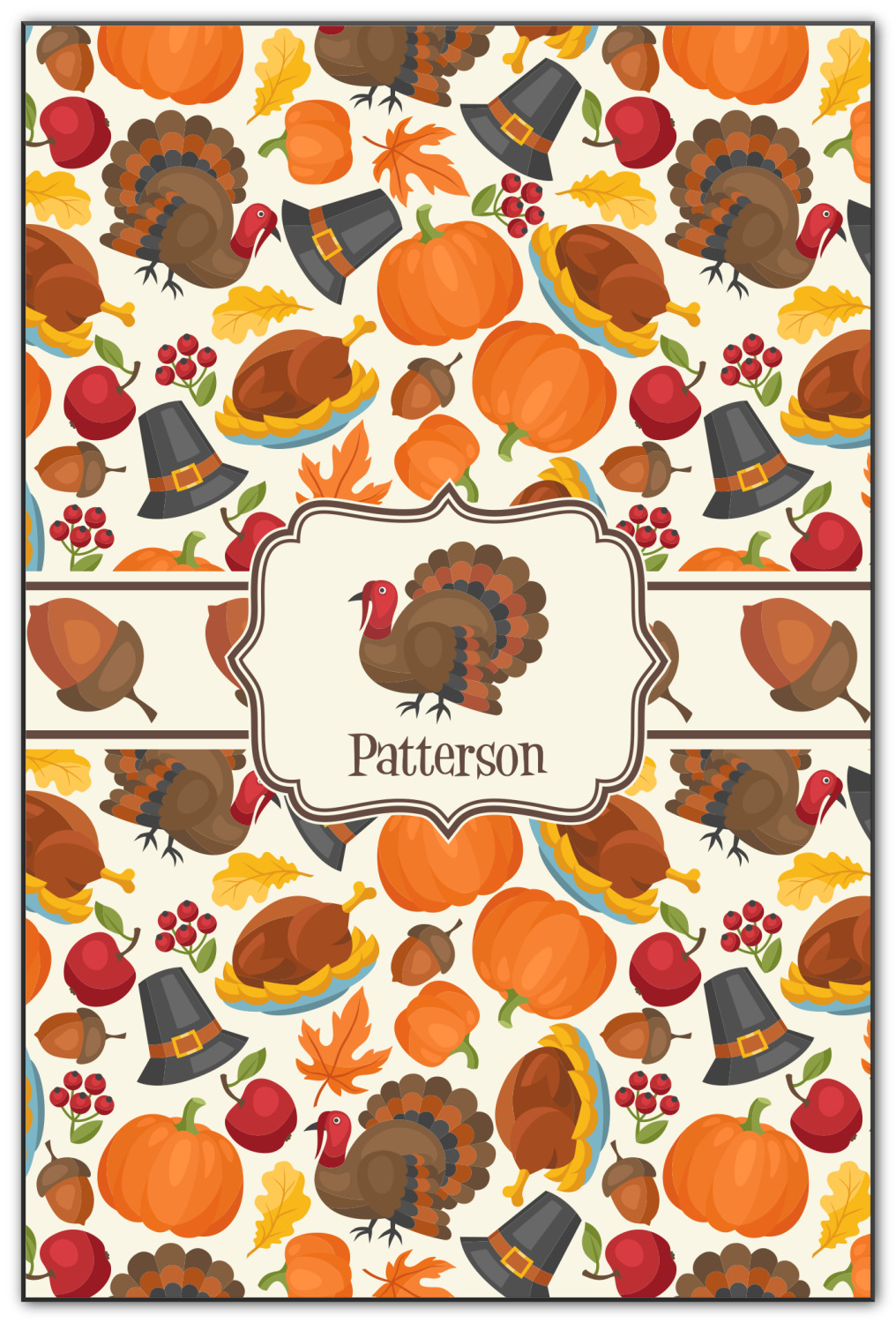 This traditional thanksgiving design is perfect for celebrating the season of giving thanks. This classic design includes turkey, pumpkin, pilgirm hat, berries, apples, acorns and leaves. The background on this design is re-color-able; and we chose the light yellow from the fall / thanksgiving color palette in our customization system.