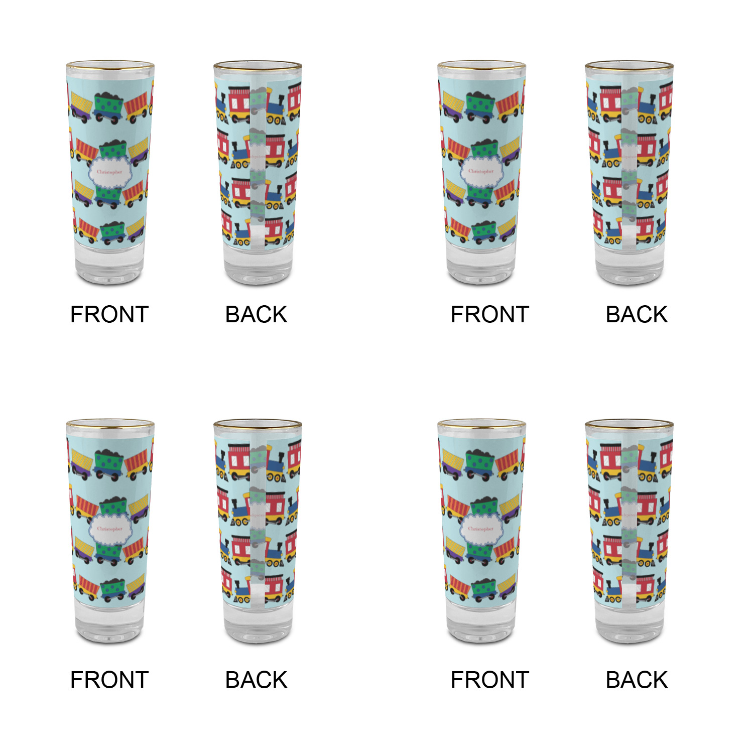 These glass shooter glasses are printed in full color with the design of your choice. These are a tall shooter 2 oz size and stand 4" tall. The print is a full wrap design to boldly display your personalization.