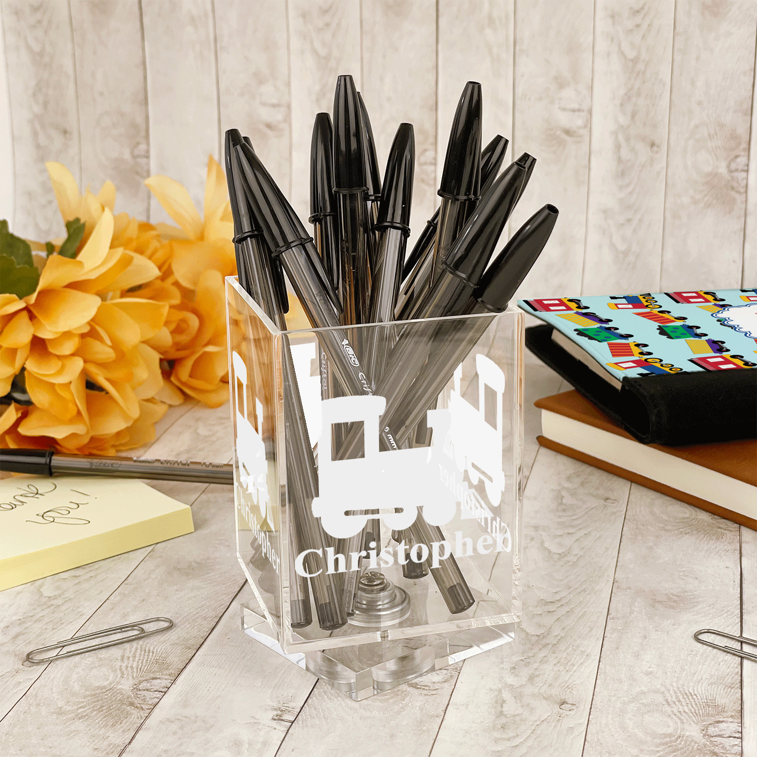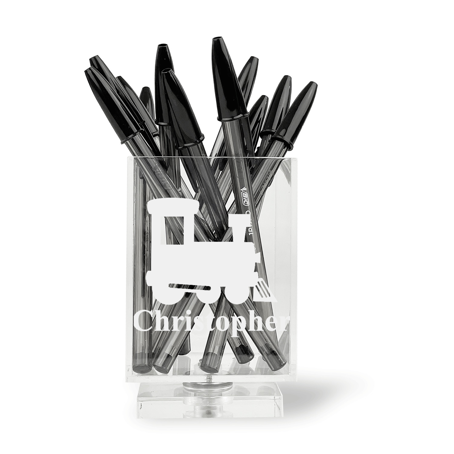 Add a great accessory to your desk with one of these acrylic pen holders. A great way to store your writing utensils, and personalized to suit your needs.