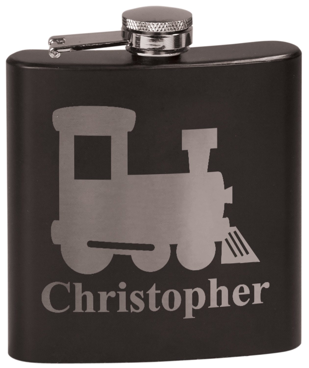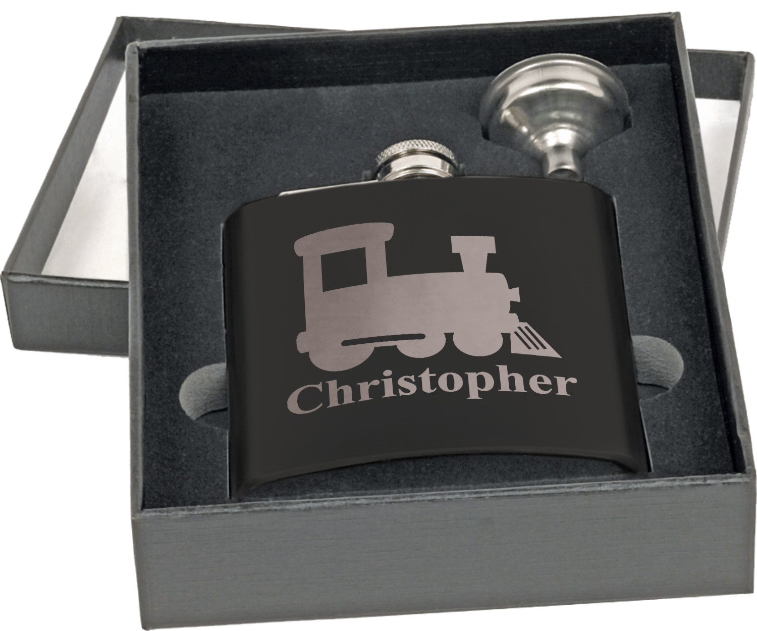 Built from a stainless steel and then covered with a black coating, this hip flask, has a very classy appearance. Similar to the standard flask, this stainless steel flask has the traditional curved shape for a snug fit in your palm. This flask set also includes a traditional screw and flip lid and liquid funnel in a gift box. At 4 by 4.5 inches, this flask can hold up to 6 ounces. Your personalized design is laser-engraved across the front of this flask.