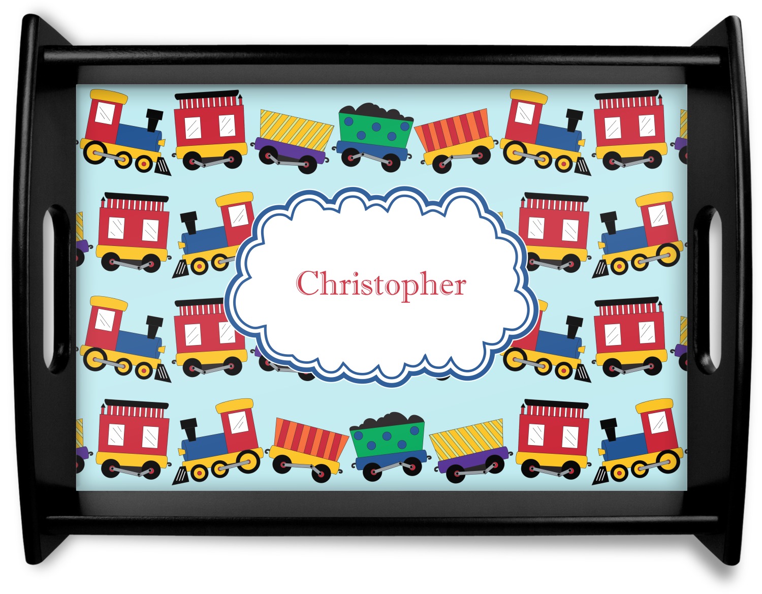 This serving tray with handles features square edges and two rounded sides, creating a very modern look. Each side is fabricated from a beautifully cut, natural wood. The bottom of the interior of the tray displays your customized design in bright, vibrant color. The tray is sold in both a black color and a natural wood look. Each variation of the wood serving tray has two sizes: Small, which is 14" x 10" x 2.25", and Large, which is 19.5" x 13.5" x 2.75".