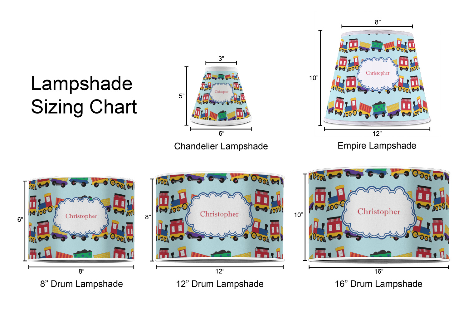Our customized lamp shades also come in 3 different sizes: 8", 12" and 16", measuring at 8" in diameter by 6" tall, 12" in diameter by 8" tall, and 16" in diameter by 10" tall, respectively.