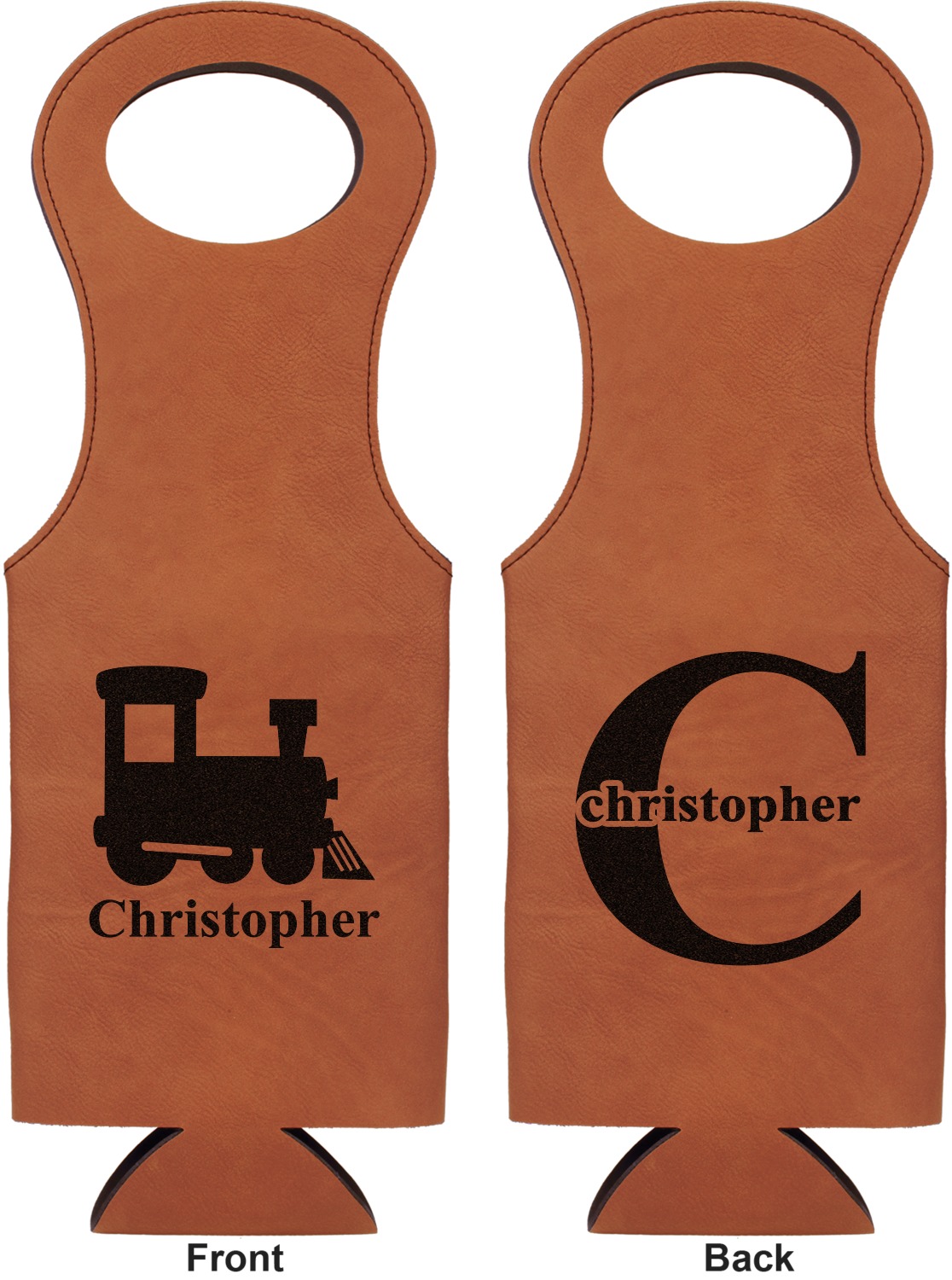 This wine carrier is made from a stunning leatherette, in a cognac-brown color. Strong, black stitching lines the sides of your wine bottle bag and provides extra durability. The interior is lined with a padded, black material to allow for a snug fit once your bottle is placed inside. At the top of this wine gift bag, you'll find two oval shaped handles that elegantly complements the rest of the bag's style. We provide you with the option of laser-engraving the front, or the front and back of your new personalized wine bag!