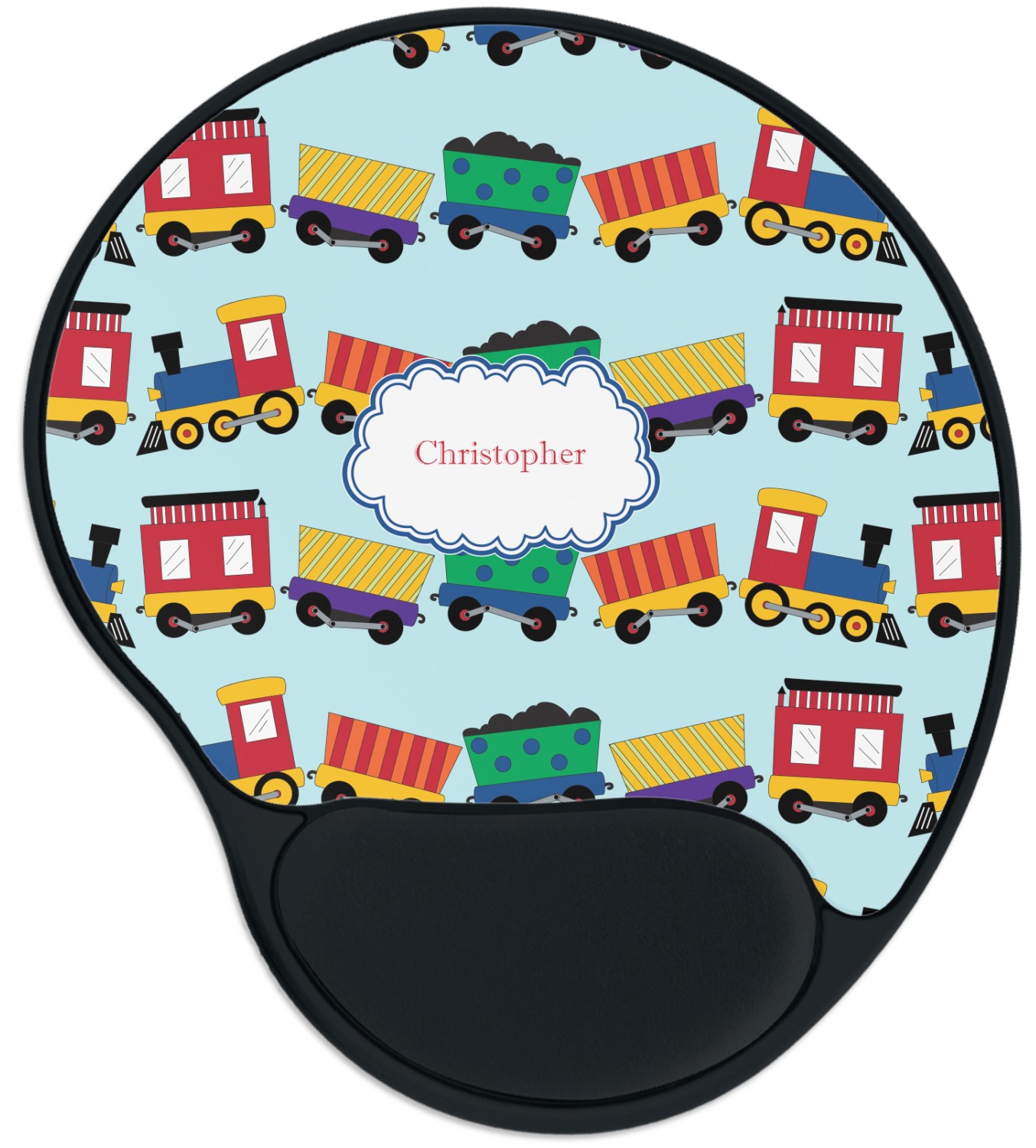 The top of these personalized mouse pads are made from a polyester, while the underside is plastic. The back of these mouse mats include rubber feet to prevent any slippage while in use. A padded wrist support, made from plush memory foam, occupies the bottom section of these computer mouse pads. Your customized design is printed onto the face of this mat, with the remaining sides and support piece colored in black. The mat itself is rounded and measures at 10.25" x 9.13".