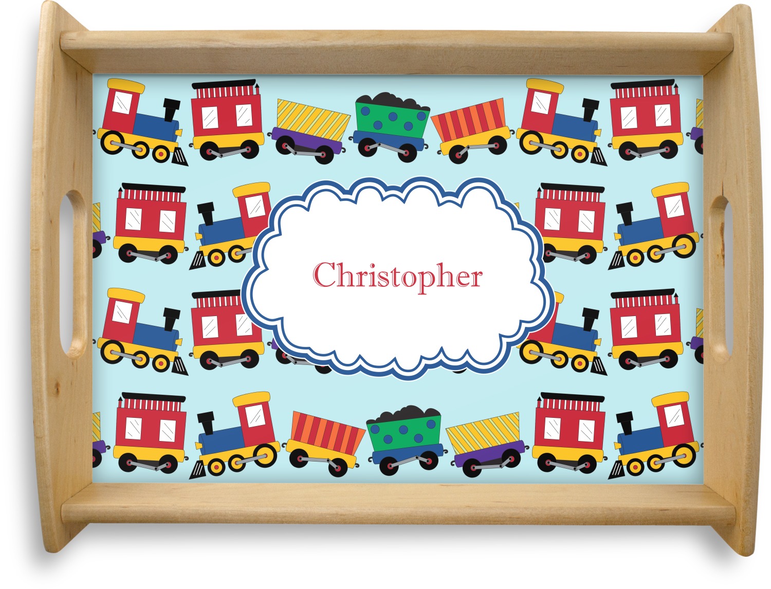 This serving tray with handles features square edges and two rounded sides, creating a very modern look. Each side is fabricated from a beautifully cut, natural wood. The bottom of the interior of the tray displays your customized design in bright, vibrant color. The tray is sold in both a black color and a natural wood look. Each variation of the wood serving tray has two sizes: Small, which is 14" x 10" x 2.25", and Large, which is 19.5" x 13.5" x 2.75".