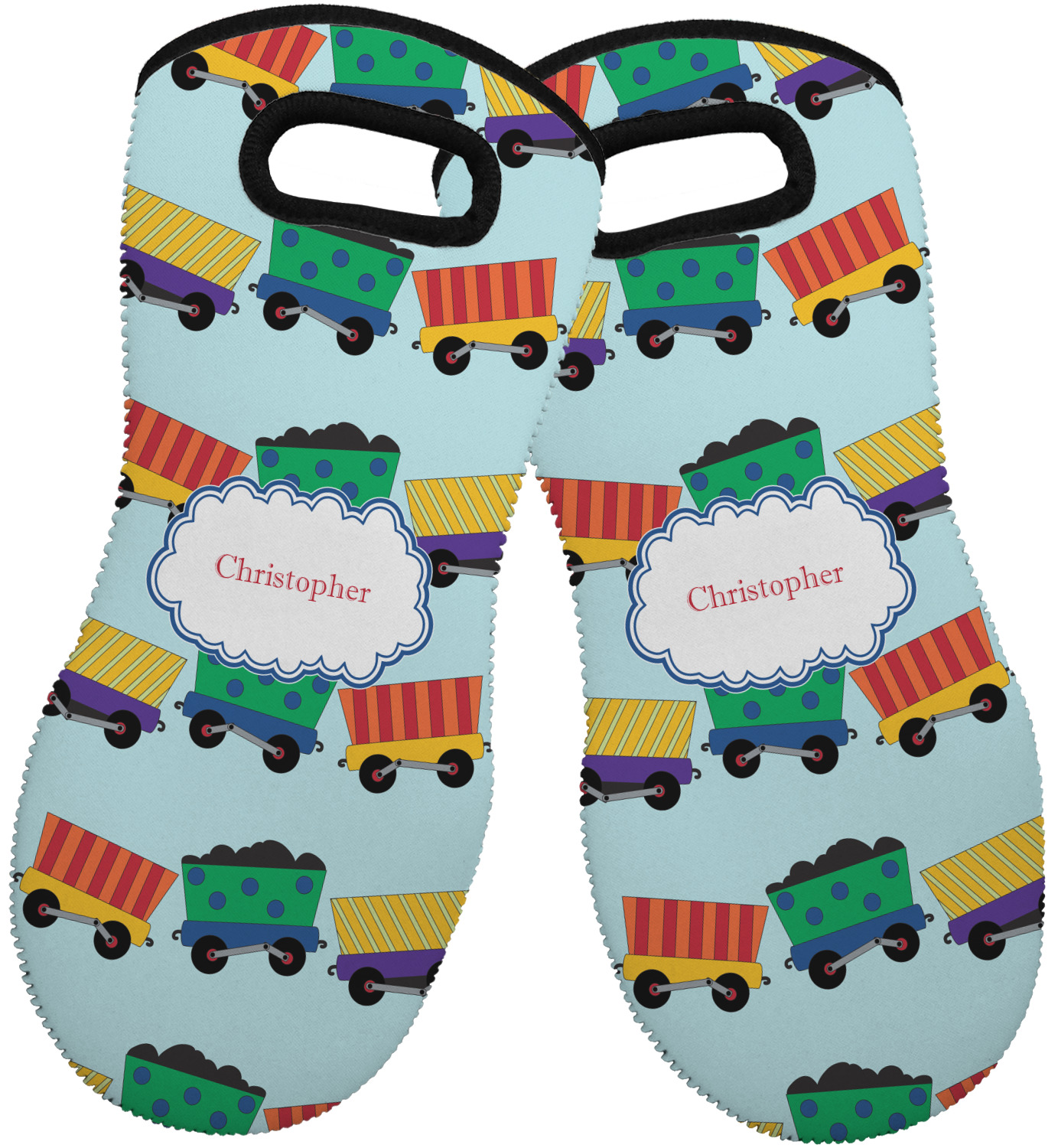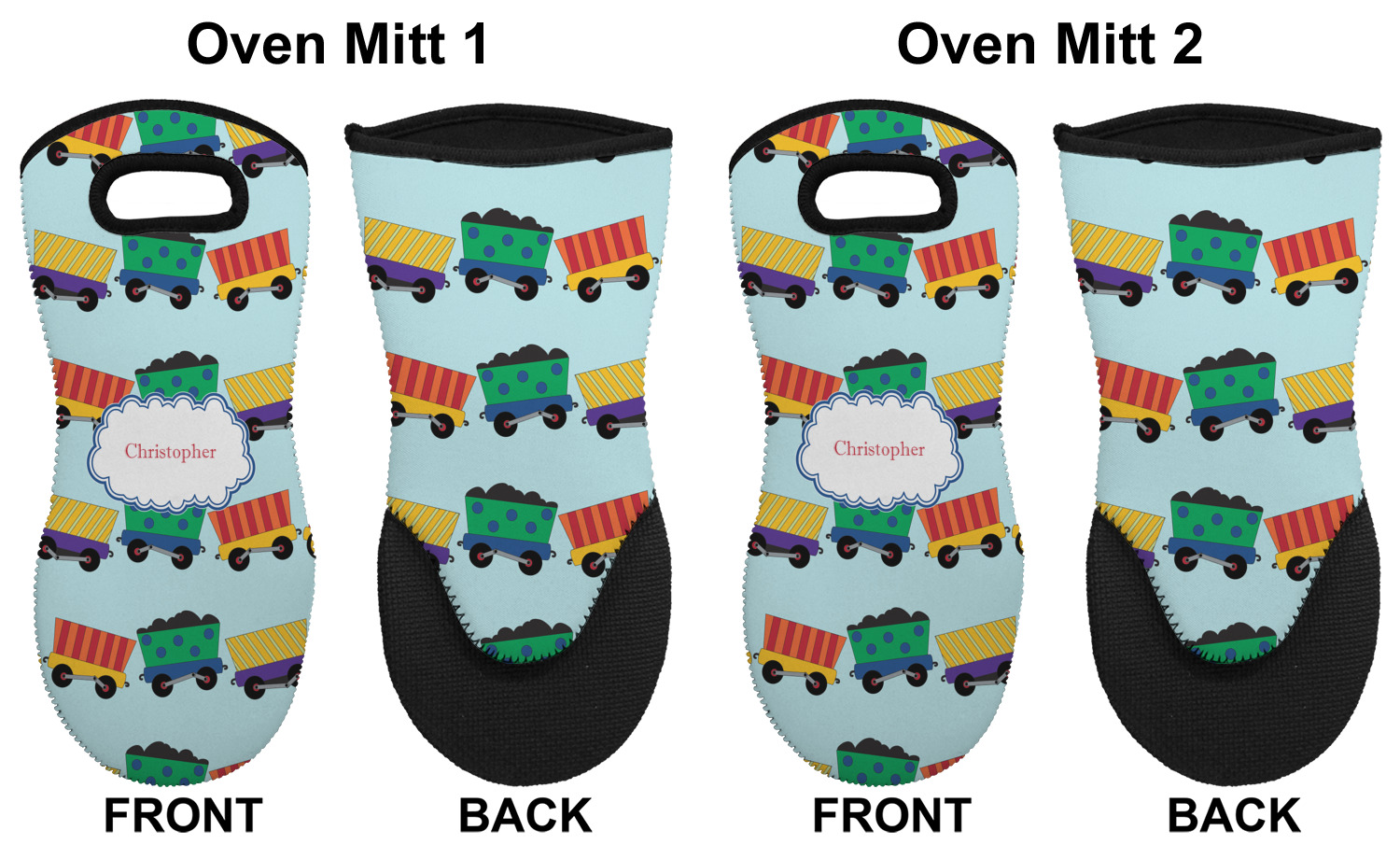 These heat resistant gloves are made entirely of a durable neoprene; the front features a softer texture, while the palm's side has a textured surface, meant to handle heat up to 500 degrees Fahrenheit. Thick, heavy duty stitching connects the two sides. A small, oval cutout appears on the front, and can be used to hang and store the mitt. Your personalization appears on the front, and the upper part of the back of the mitt. The style of these oven mitts are suitable for both the right and left hand, depending on your needs. If you need one for each hand, be sure to order two!
