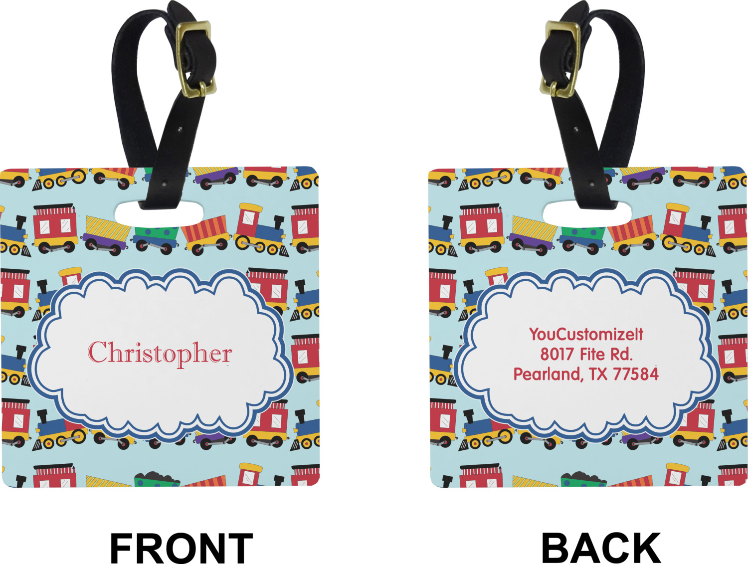 These personalized bag tags are sold in a variety of shapes, so that you may find the product that meets your vision exactly. We sell a round luggage tag, which measures at approximately 4" x 4". Our square luggage tag is about 3.5" x 3.5", while our rectangular version is 2.75" x 4 ".