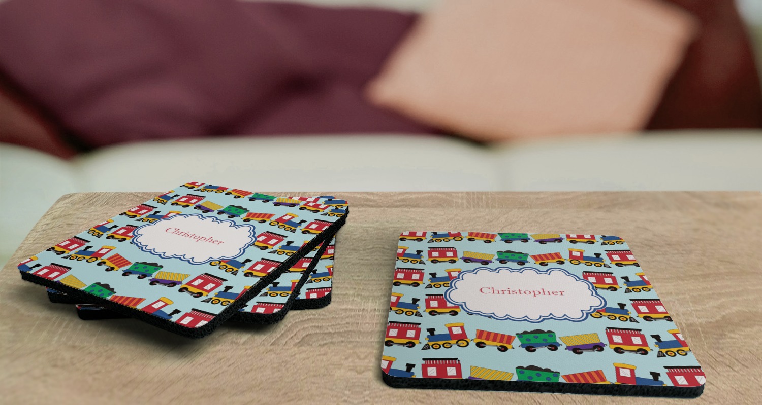 These drink coasters have a smooth, polyester top and a textured, rubber backing on its bottom. The non-slip rubber backing underneath works to keep any spills at bay. At 4 by 4 by 0.25 inches thick, these custom coasters are a suitable size for most drinkware. Your personalization is displayed atop the face of the cup coaster. We sell these rubber coasters in two different shapes: square and round. You can buy each shape as singulars or as a set of 4.
