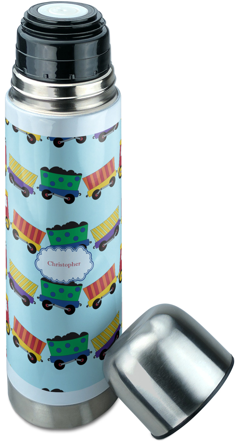 Manufactured from stainless steel, this thermos is built durably and double-walled insulated to preserve the temperature of your drink for hours. It also features a screw off lid that is made to also function as a small cup. Upon unscrewing this part of the thermos bottle, a pop-open, pour feature emerges. This feature allows you to slowly pour your beverage into your lid, ensuring a steady, controlled pour into your lid or other cup. With a capacity of 25 ounces, these large thermoses can hold several servings of your favorite beverage. Your customization is displayed all around the bottle with bright, vibrant color.