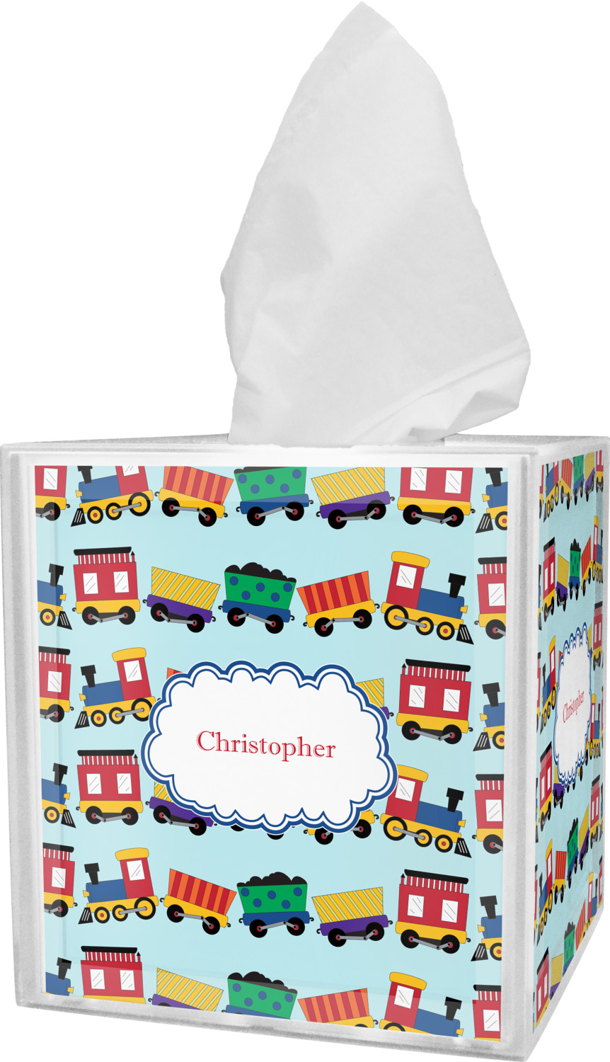 These tissue holders are built from durable acrylic and display your unique personalization on fine-quality vinyl inserts placed within the four sides and top. The box features two pieces, allowing you to easily switch out tissue boxes. On the sides, youll find ridges that ensure the top and base fit securely in place. The bottom of these tissue box holders has four, rubber, non-slip pads to prevent the box from scuffing any surface you decide to display it on. Each box can fit a standard 5 by 5-inch box of tissues.