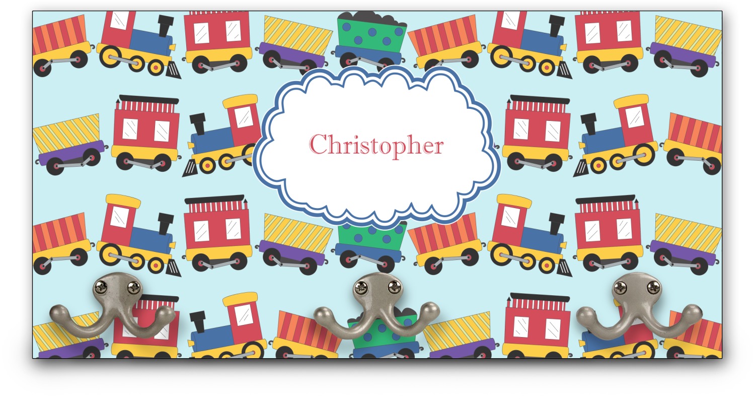 This coat rack is the perfect way to add some personality to your wall or entryway. The board is made of a strong maple that is approximately 16" x 8". The three 2-prong hooks are a sturdy metal that have three screws attaching them to the board. Your design is printed right onto the front of the board while the back and sides are a simple black.