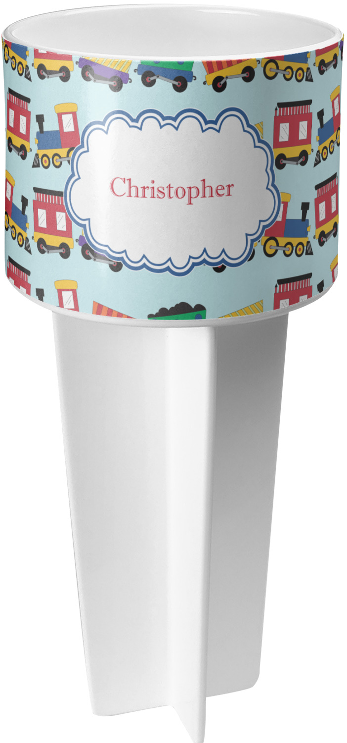 This cup holder has a large stake at its bottom that anchors it to the sand or ground below, while the cup holder rests above the stake. The entire drink holder is made of durable plastic and displays your customization around the cup holder portion. We sell these personalized beach spikers in two different colors: black and white.