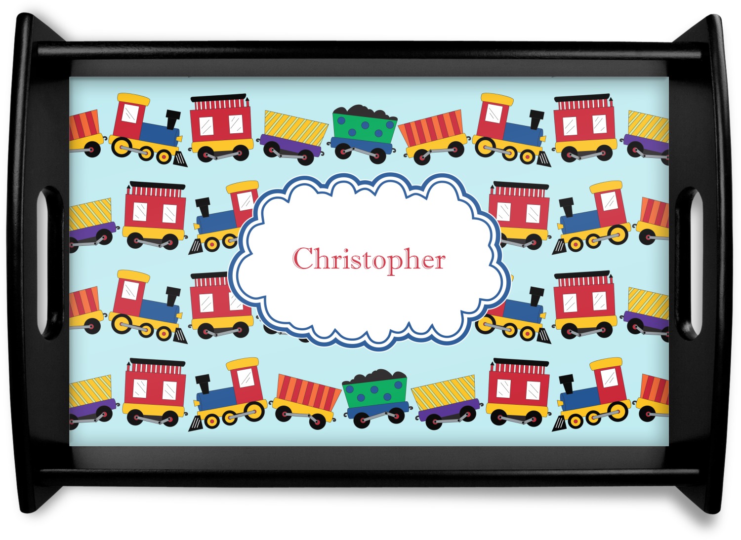 This serving tray with handles features square edges and two rounded sides, creating a very modern look. Each side is fabricated from a beautifully cut, natural wood. The bottom of the interior of the tray displays your customized design in bright, vibrant color. The tray is sold in both a black color and a natural wood look. Each variation of the wood serving tray has two sizes: Small, which is 14" x 10" x 2.25", and Large, which is 19.5" x 13.5" x 2.75".