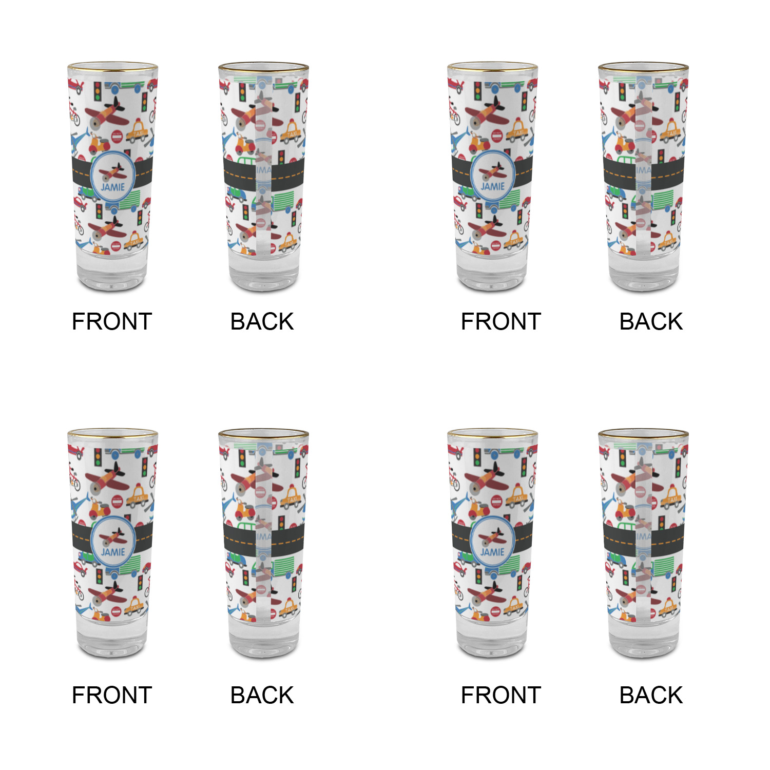 These glass shooter glasses are printed in full color with the design of your choice. These are a tall shooter 2 oz size and stand 4" tall. The print is a full wrap design to boldly display your personalization.