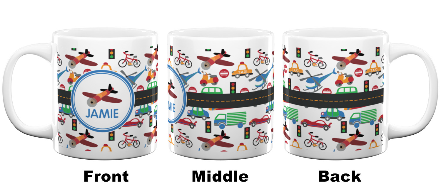 A gray with yellow "road" band ties the two patterns together. A blue and white circle label showcases an airplane with room underneath to add personalization of your choice. You can customize further by picking any of the transportation pictures in the pattern to place in the label. Just let us know what you want.
