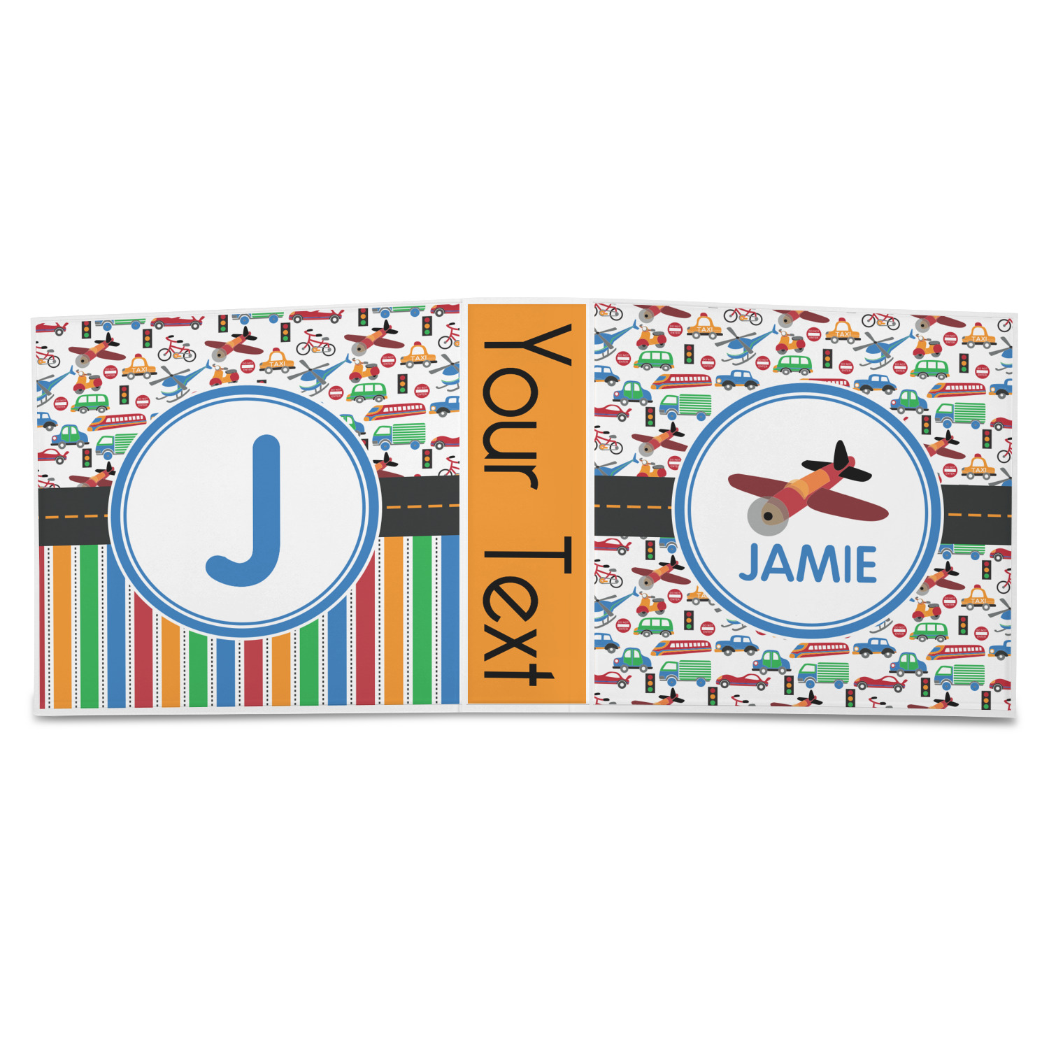 A gray with yellow "road" band ties the two patterns together. A blue and white circle label showcases an airplane with room underneath to add personalization of your choice. You can customize further by picking any of the transportation pictures in the pattern to place in the label. Just let us know what you want.