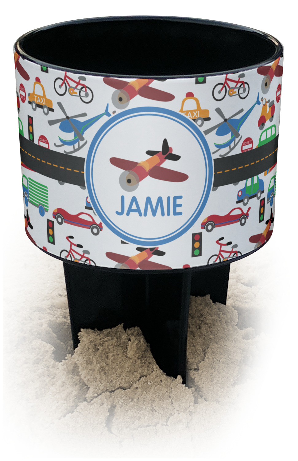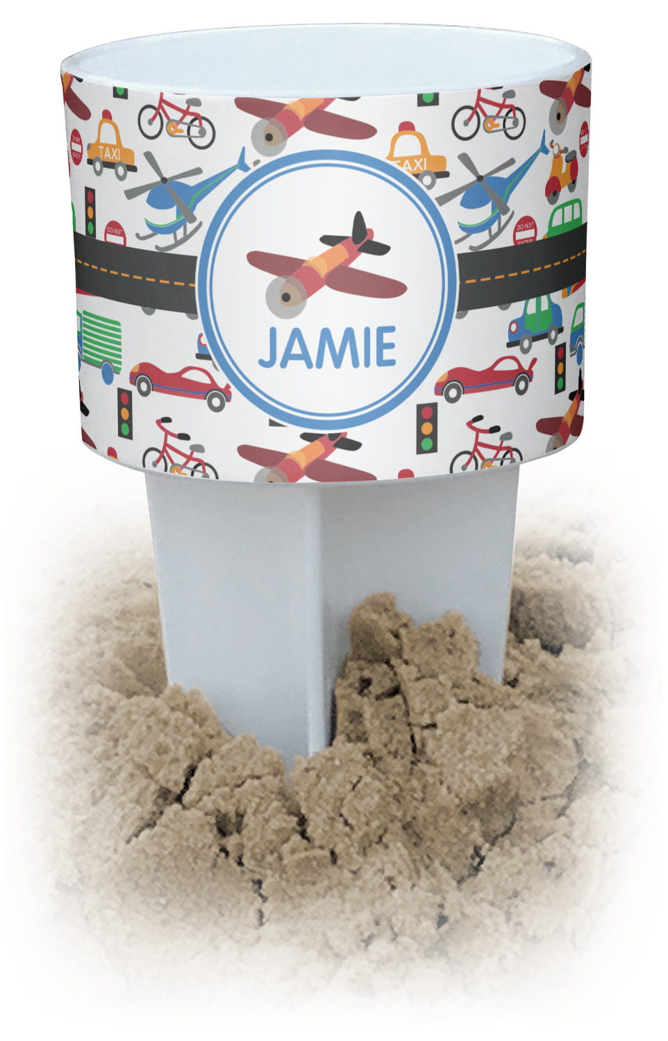 This cup holder has a large stake at its bottom that anchors it to the sand or ground below, while the cup holder rests above the stake. The entire drink holder is made of durable plastic and displays your customization around the cup holder portion. We sell these personalized beach spikers in two different colors: black and white.