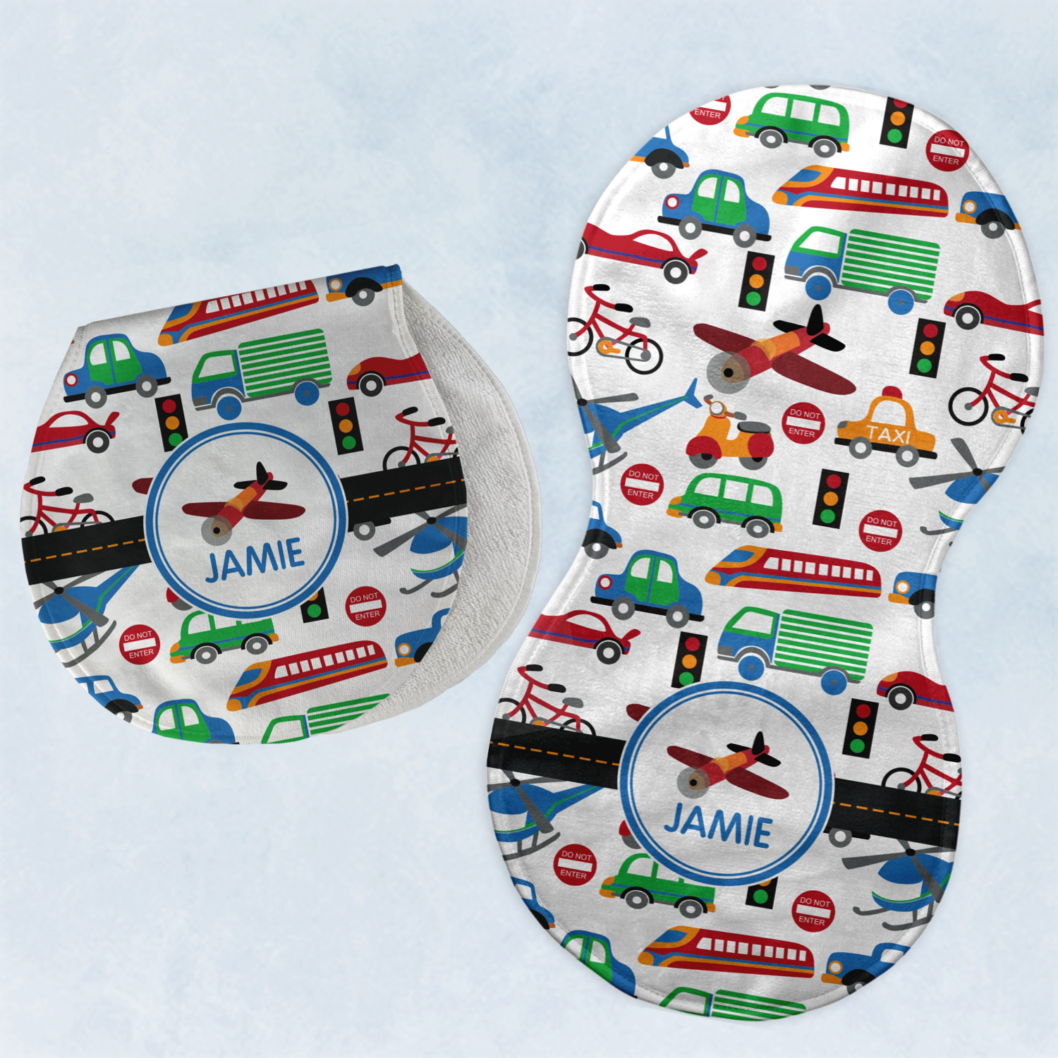 A gray with yellow "road" band ties the two patterns together. A blue and white circle label showcases an airplane with room underneath to add personalization of your choice. You can customize further by picking any of the transportation pictures in the pattern to place in the label. Just let us know what you want.