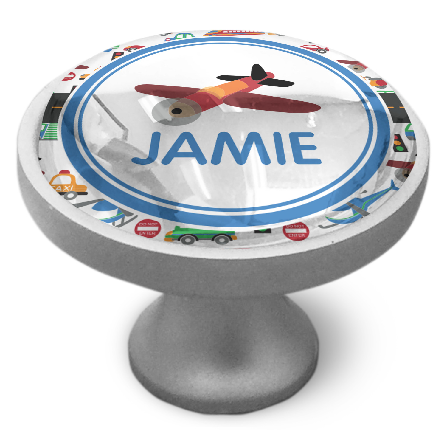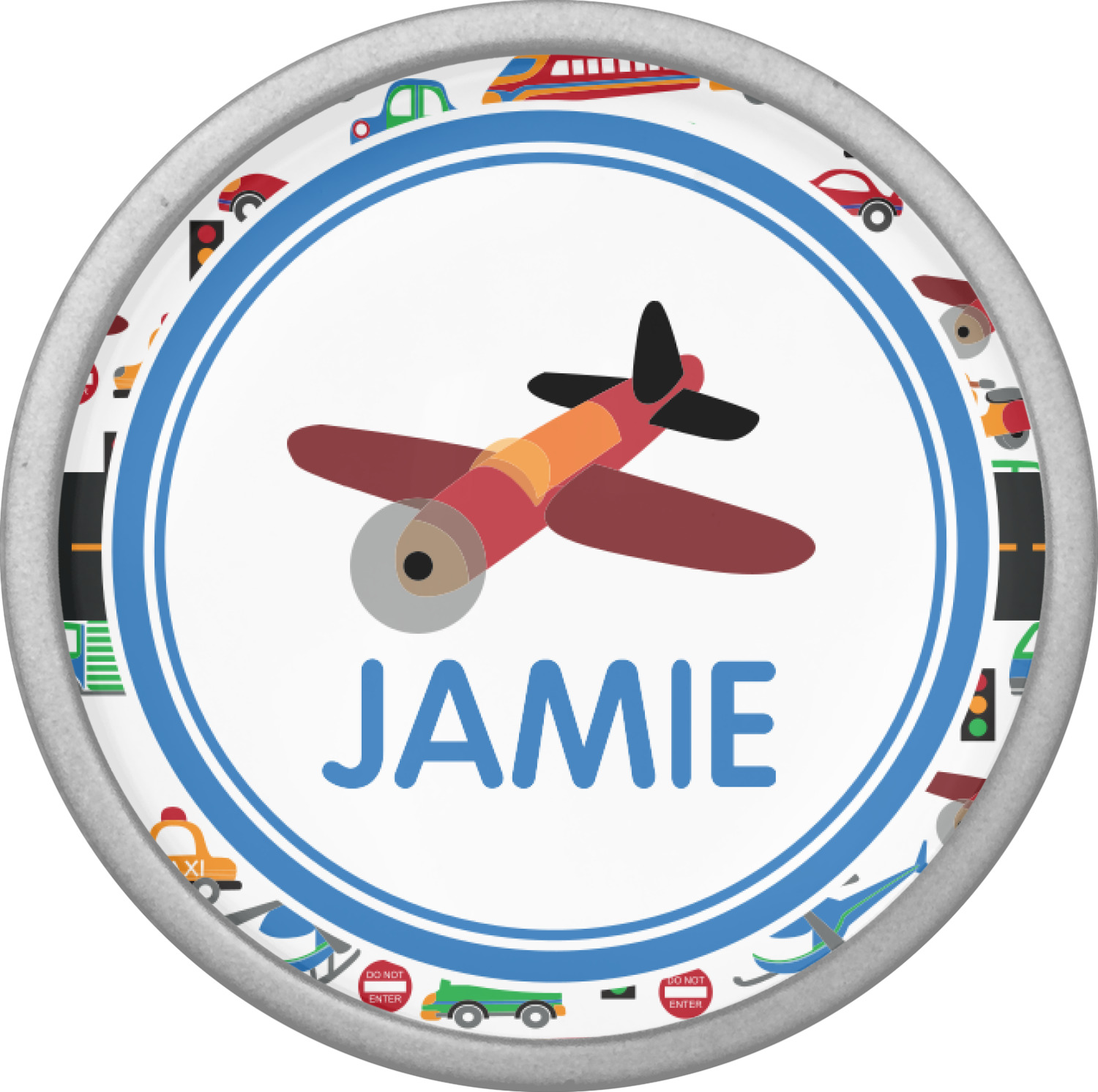 A gray with yellow "road" band ties the two patterns together. A blue and white circle label showcases an airplane with room underneath to add personalization of your choice. You can customize further by picking any of the transportation pictures in the pattern to place in the label. Just let us know what you want.