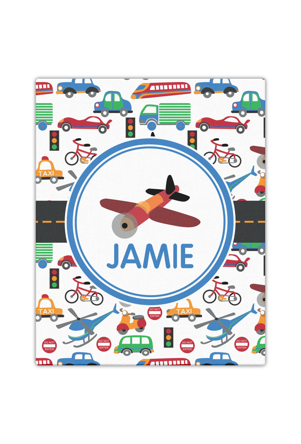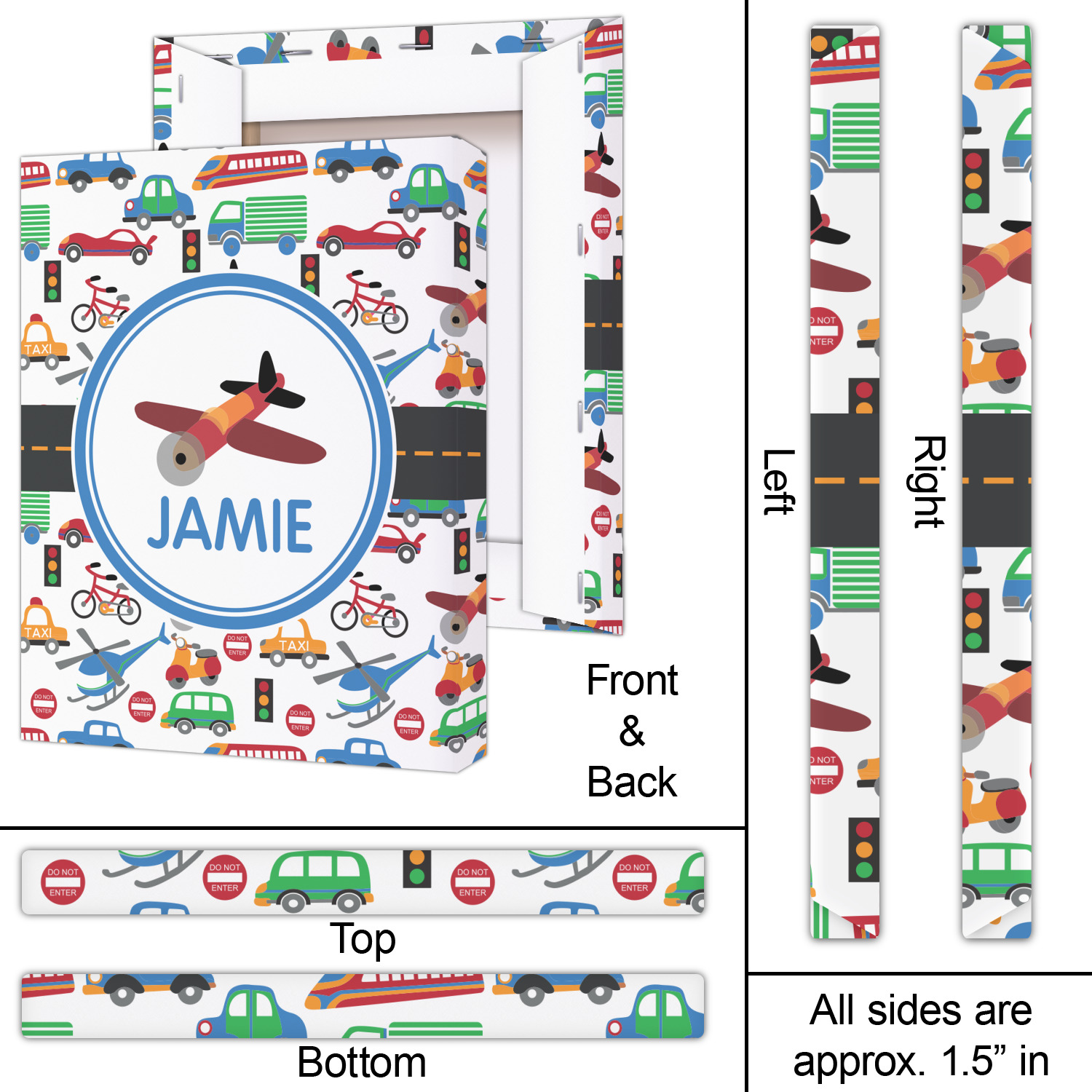 A gray with yellow "road" band ties the two patterns together. A blue and white circle label showcases an airplane with room underneath to add personalization of your choice. You can customize further by picking any of the transportation pictures in the pattern to place in the label. Just let us know what you want.