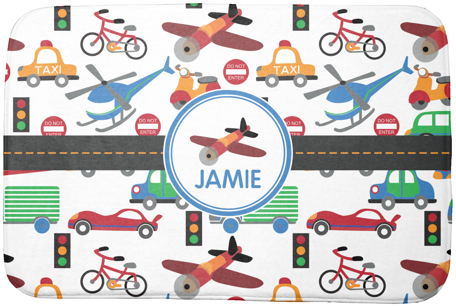 A gray with yellow "road" band ties the two patterns together. A blue and white circle label showcases an airplane with room underneath to add personalization of your choice. You can customize further by picking any of the transportation pictures in the pattern to place in the label. Just let us know what you want.