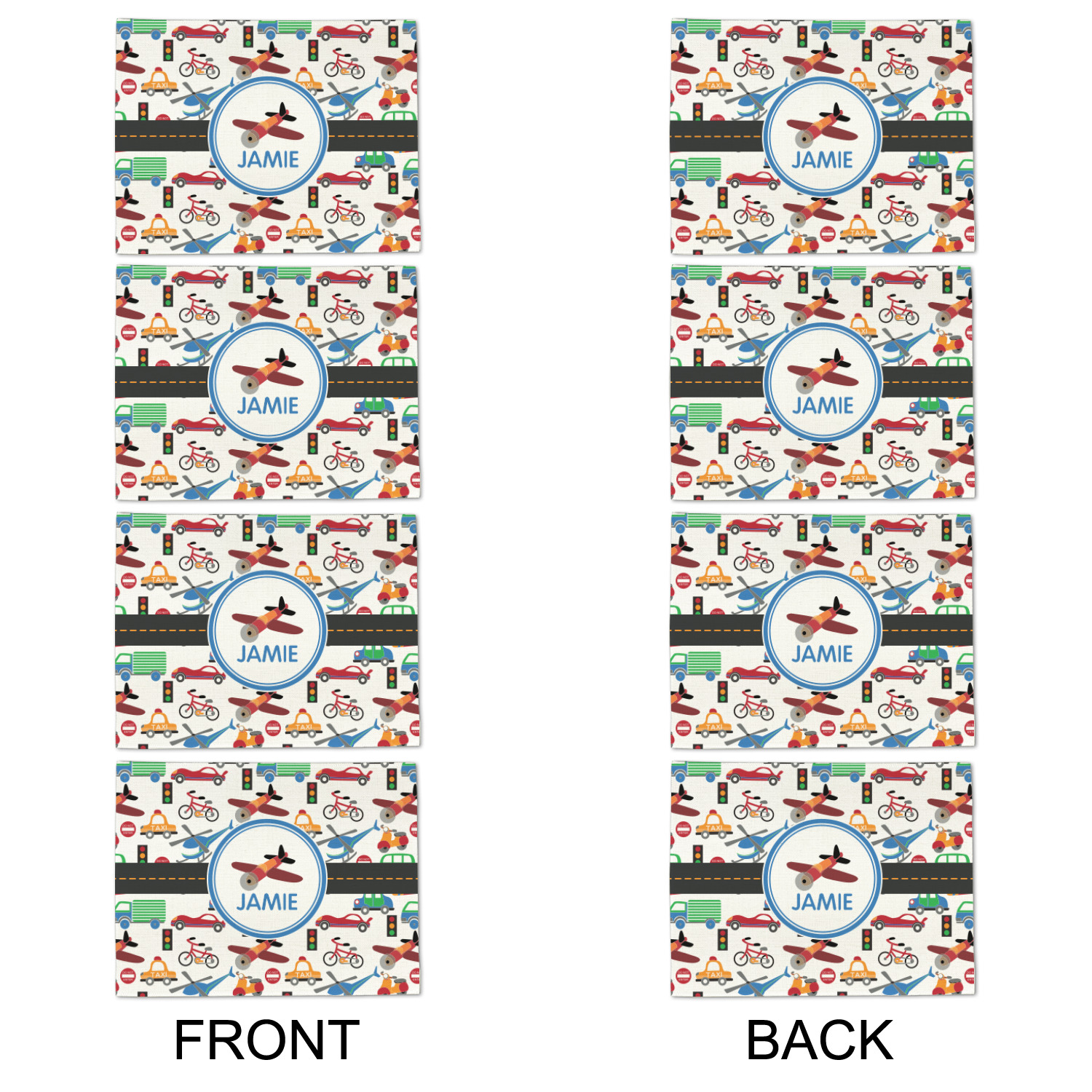A gray with yellow "road" band ties the two patterns together. A blue and white circle label showcases an airplane with room underneath to add personalization of your choice. You can customize further by picking any of the transportation pictures in the pattern to place in the label. Just let us know what you want.