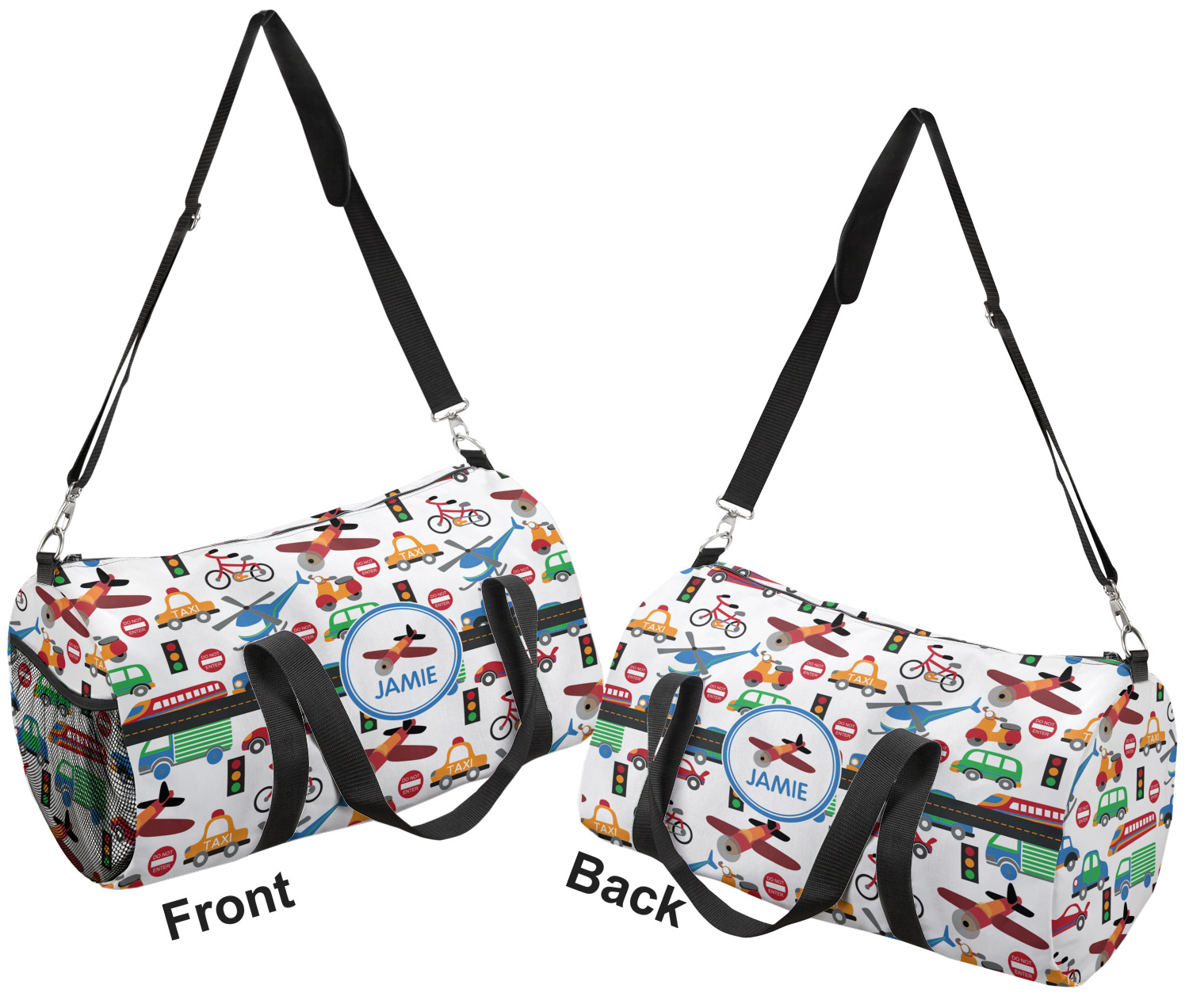 This duffle is a sturdy bag made of a canvas material. It comes in two sizes: Small (19"W x 9.5"H x 9.5"D) and Large (23"W x 12"H x 12"D). The bag is a cylindrical shape with a black adjustable strap and two handles. On one side is an elastic pouch to put a waterbottle or other small item. Your product will be sublimated with your design and is able to be designed on the front, back, and sides. Be sure to remember that the straps may cut into parts of your design if you upload your own artwork.