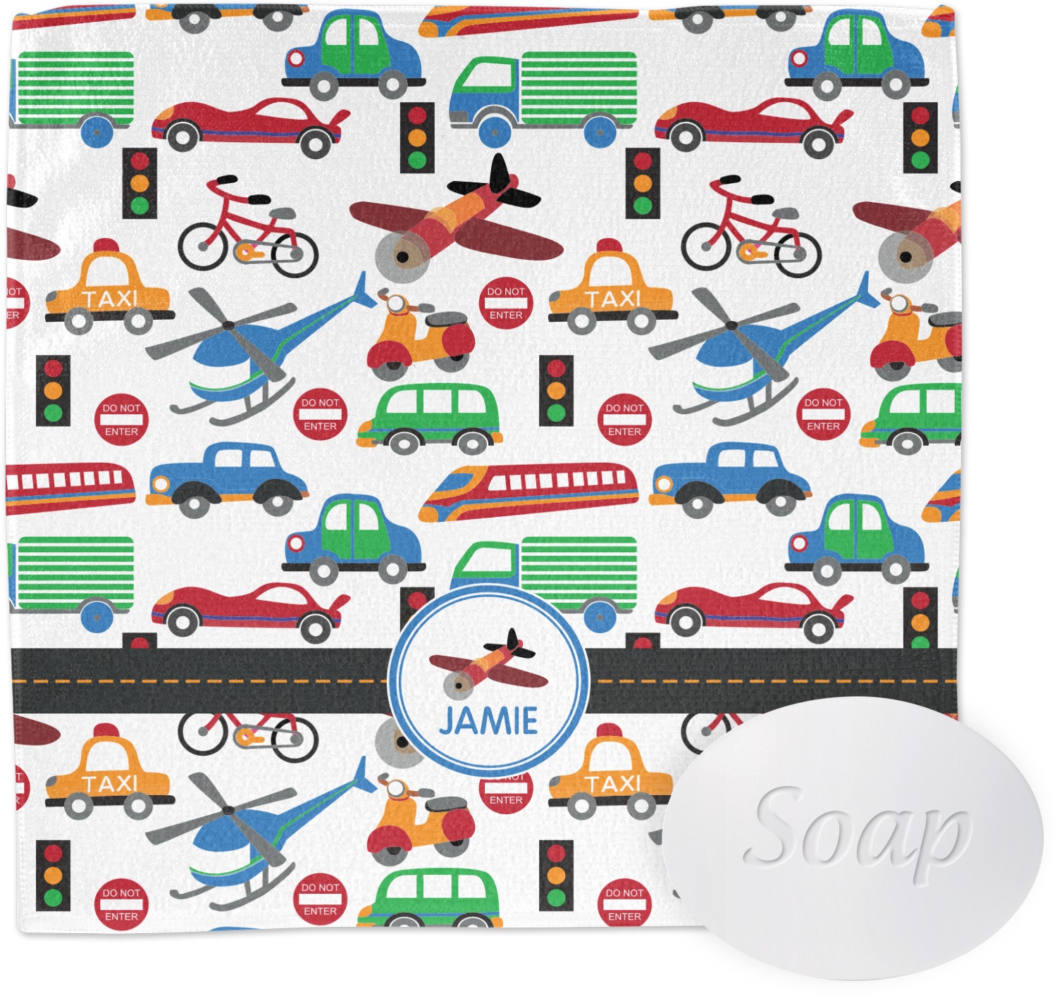 A gray with yellow "road" band ties the two patterns together. A blue and white circle label showcases an airplane with room underneath to add personalization of your choice. You can customize further by picking any of the transportation pictures in the pattern to place in the label. Just let us know what you want.
