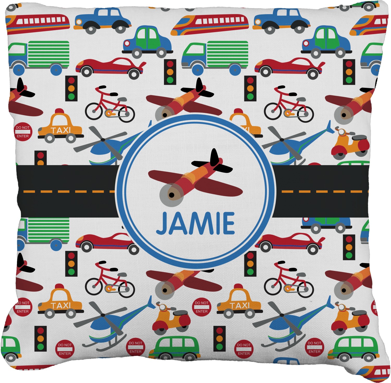 A gray with yellow "road" band ties the two patterns together. A blue and white circle label showcases an airplane with room underneath to add personalization of your choice. You can customize further by picking any of the transportation pictures in the pattern to place in the label. Just let us know what you want.