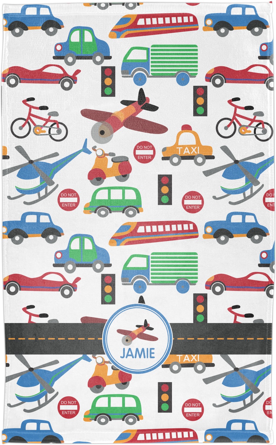 A gray with yellow "road" band ties the two patterns together. A blue and white circle label showcases an airplane with room underneath to add personalization of your choice. You can customize further by picking any of the transportation pictures in the pattern to place in the label. Just let us know what you want.